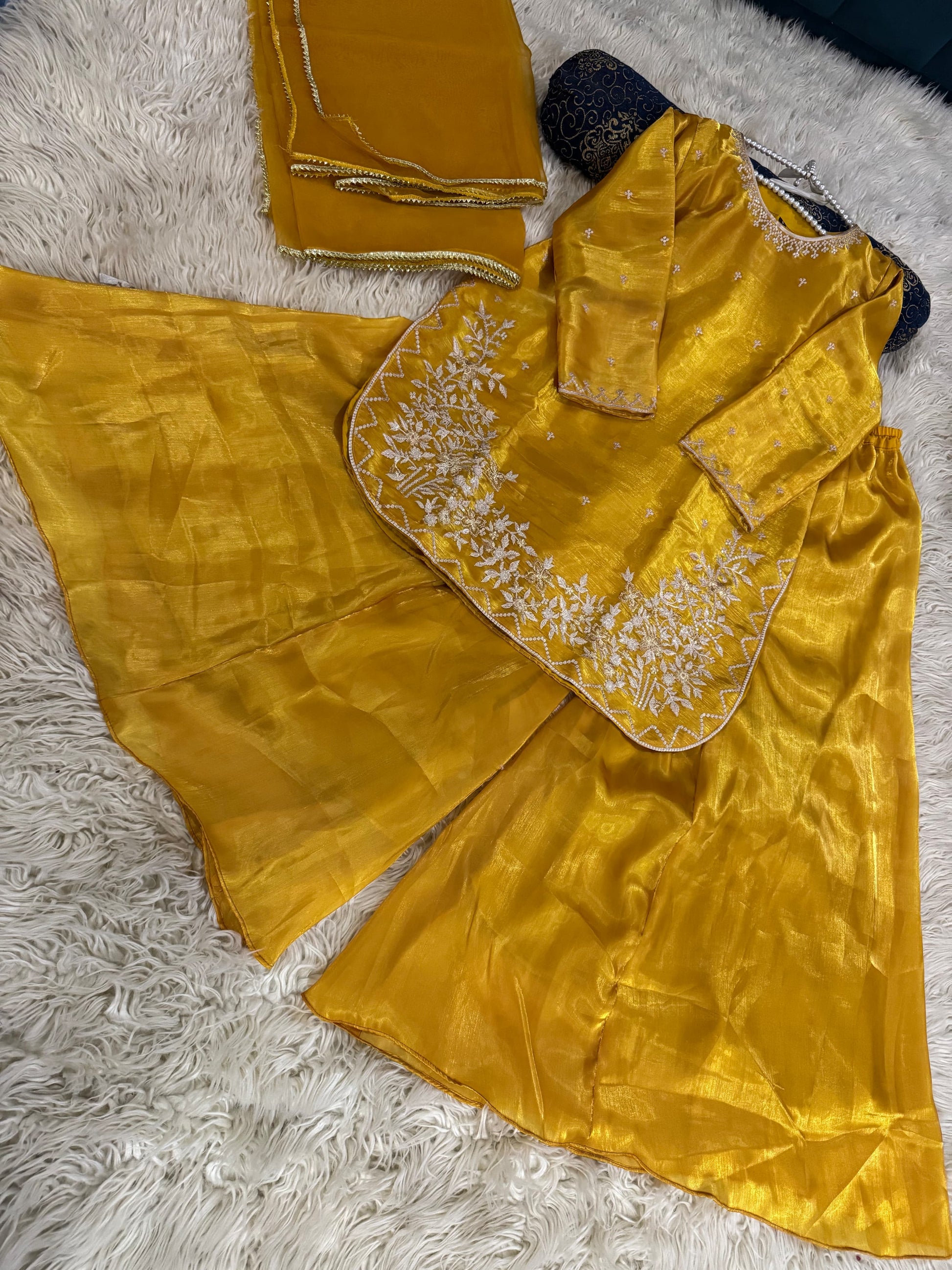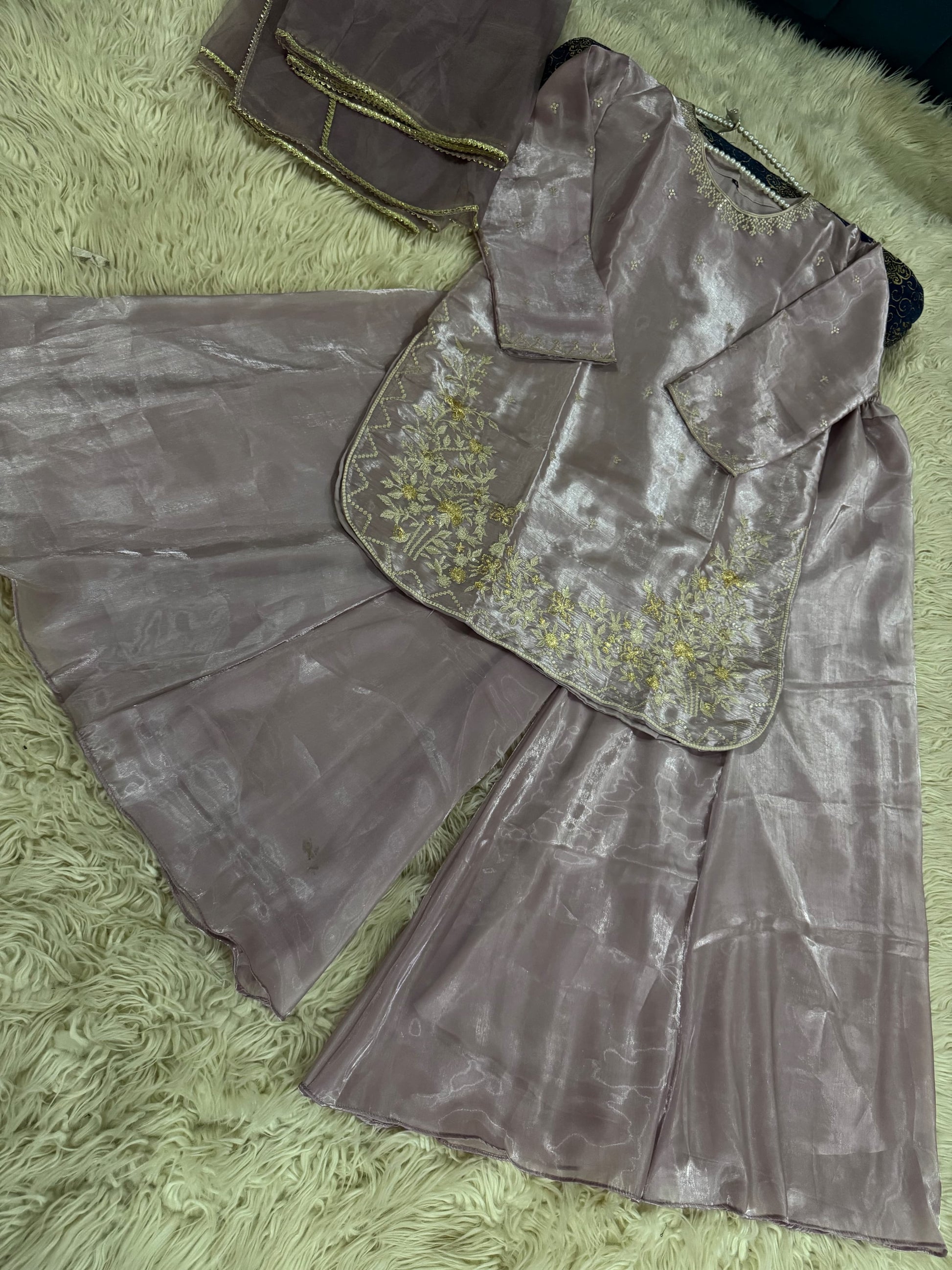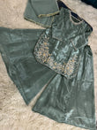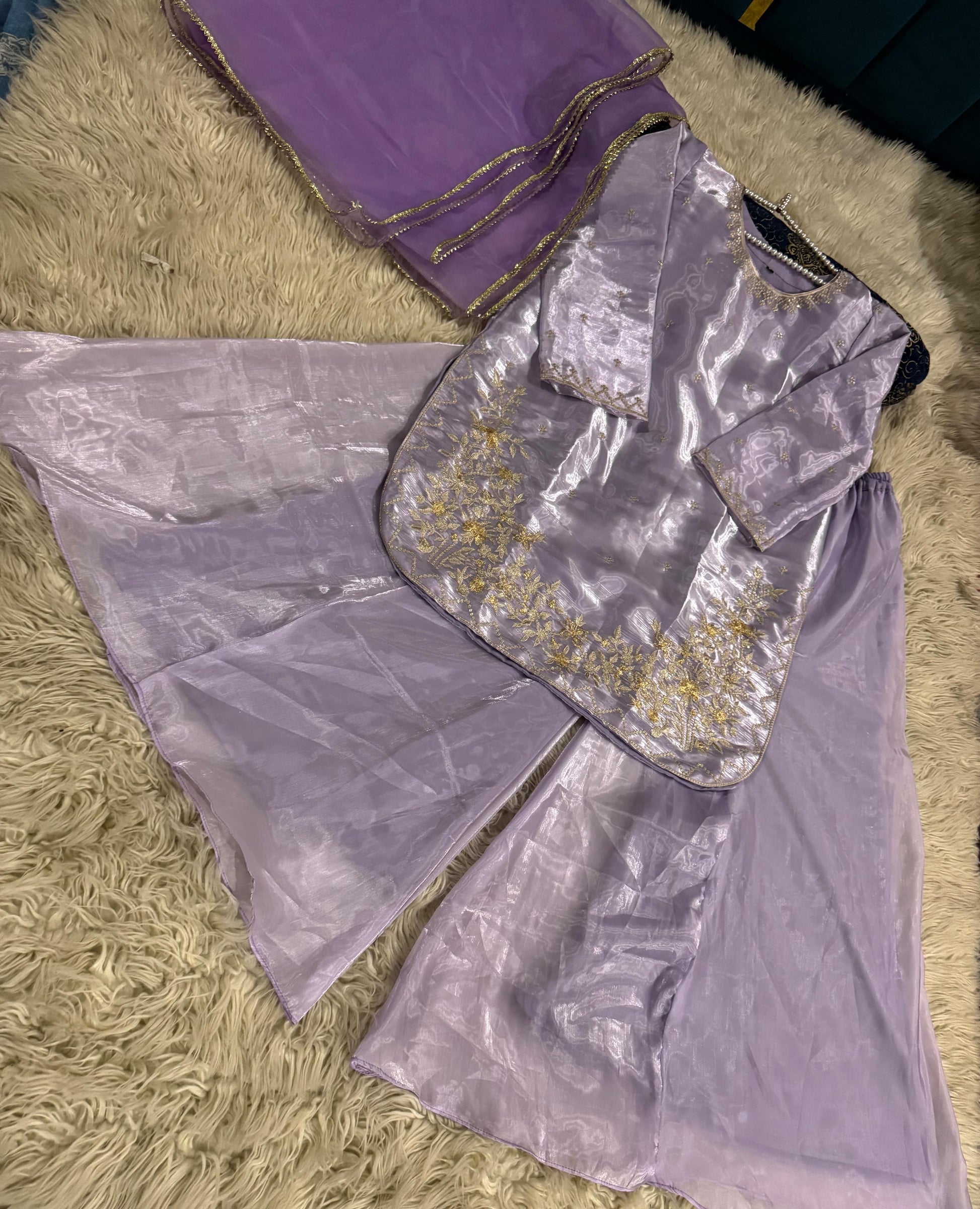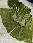 Expertly tailored and stylish, AVERNA is crafted with luxurious Shisha silk fabric, providing comfortable wear. The elegant embossed long shirt and detailing add a touch of sophistication. Paired with a Kattan silk Ghrara, this outfit exudes class and timeless appeal.