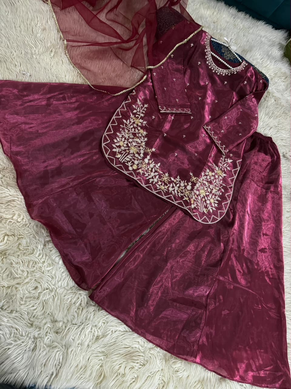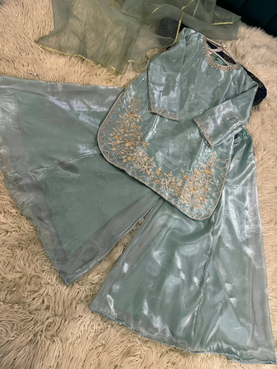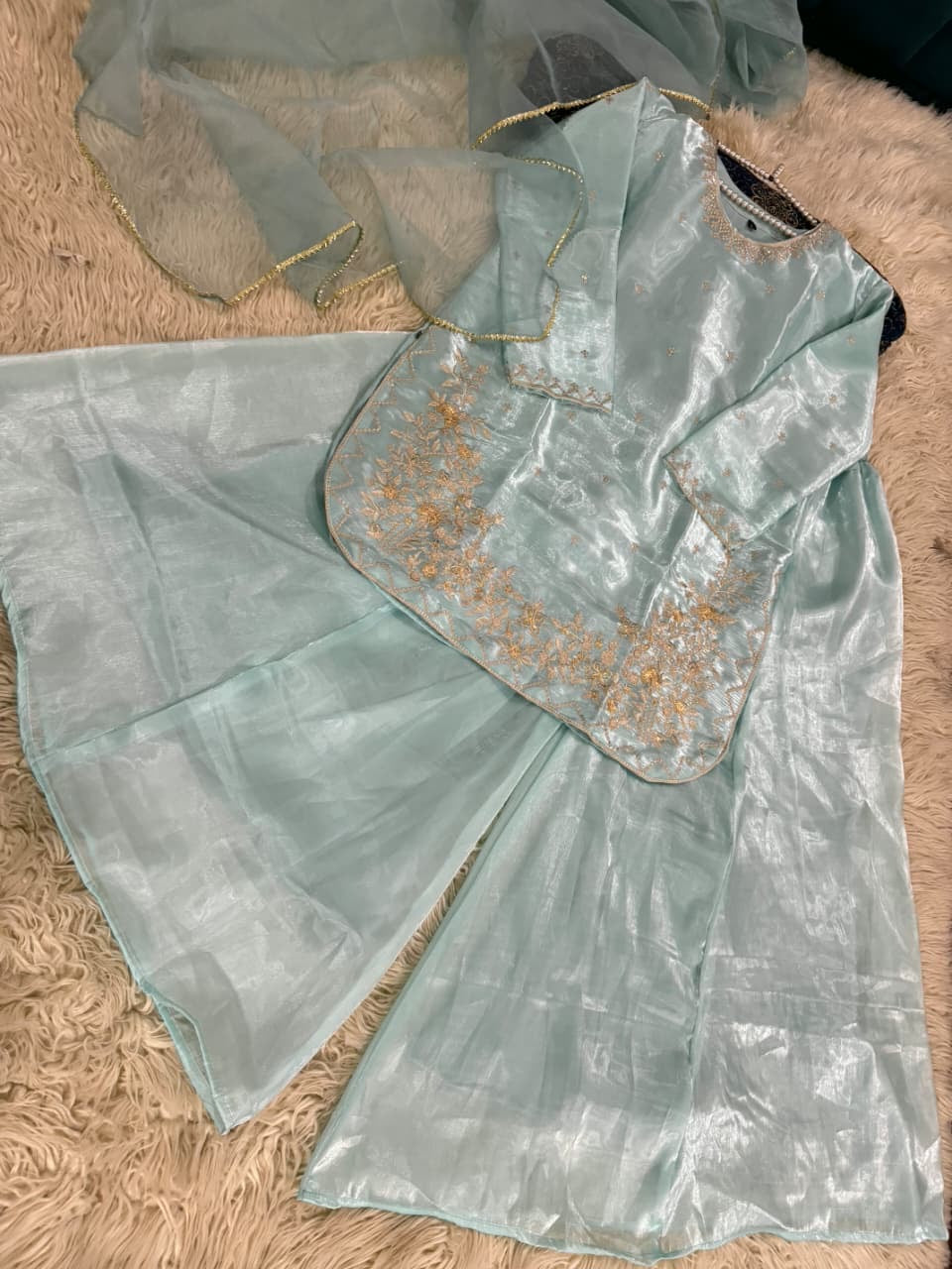 Expertly tailored and stylish, AVERNA is crafted with luxurious Shisha silk fabric, providing comfortable wear. The elegant embossed long shirt and detailing add a touch of sophistication. Paired with a Kattan silk Ghrara, this outfit exudes class and timeless appeal.