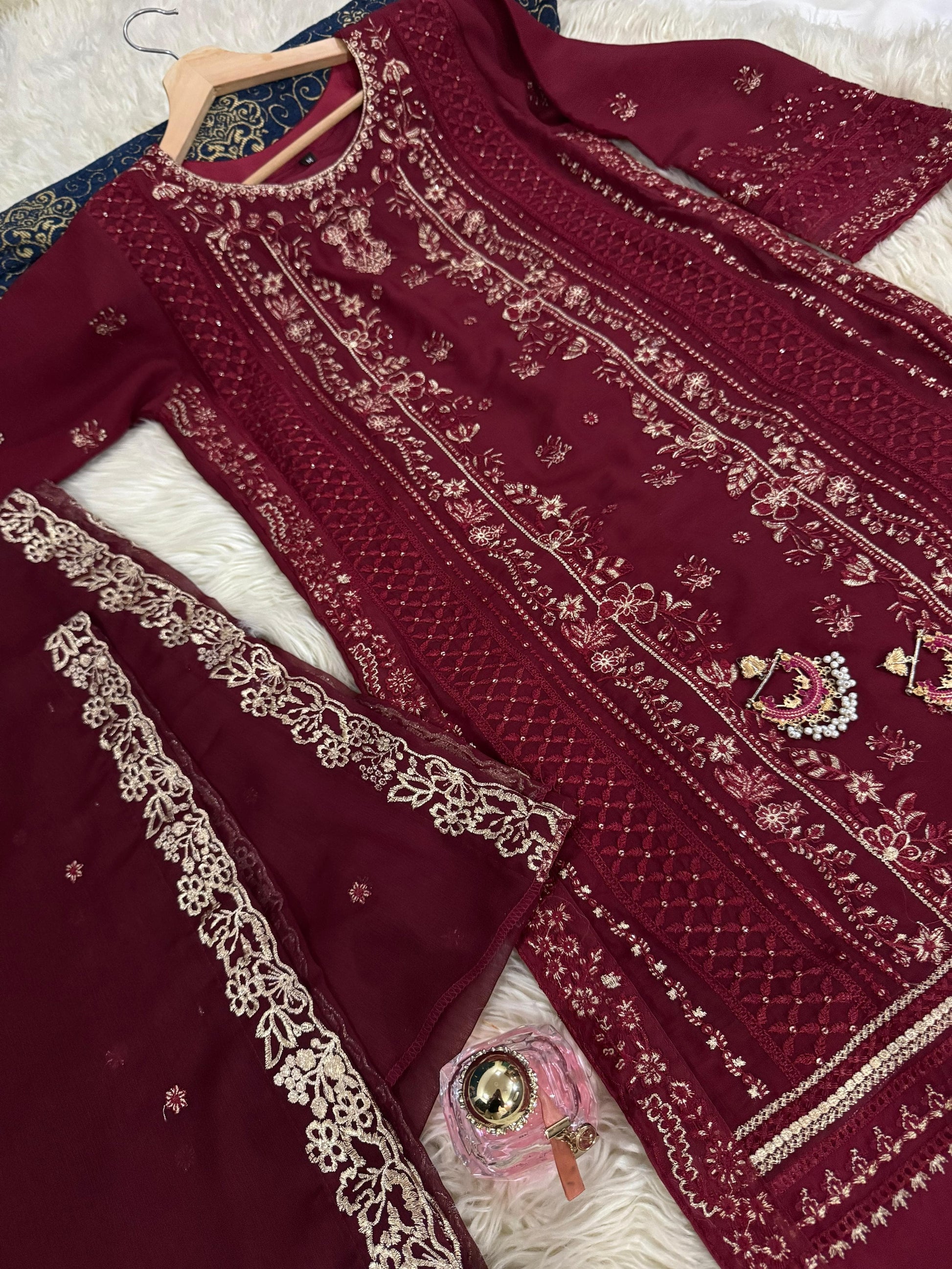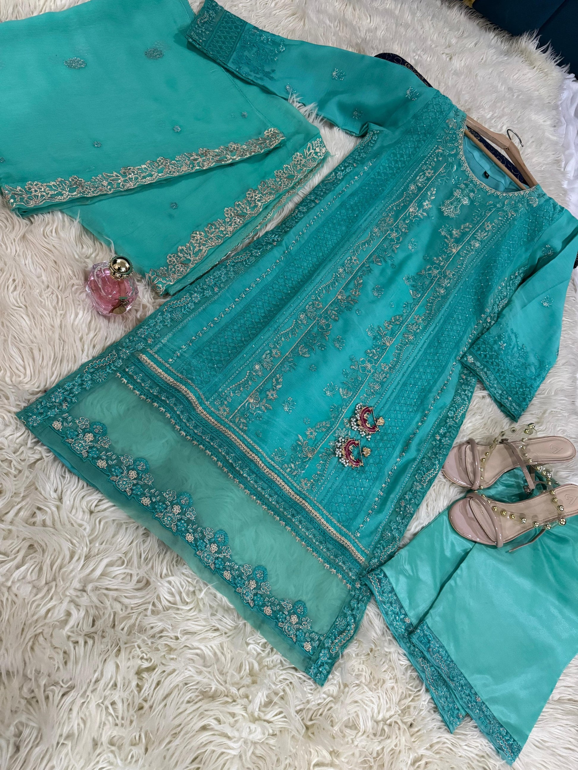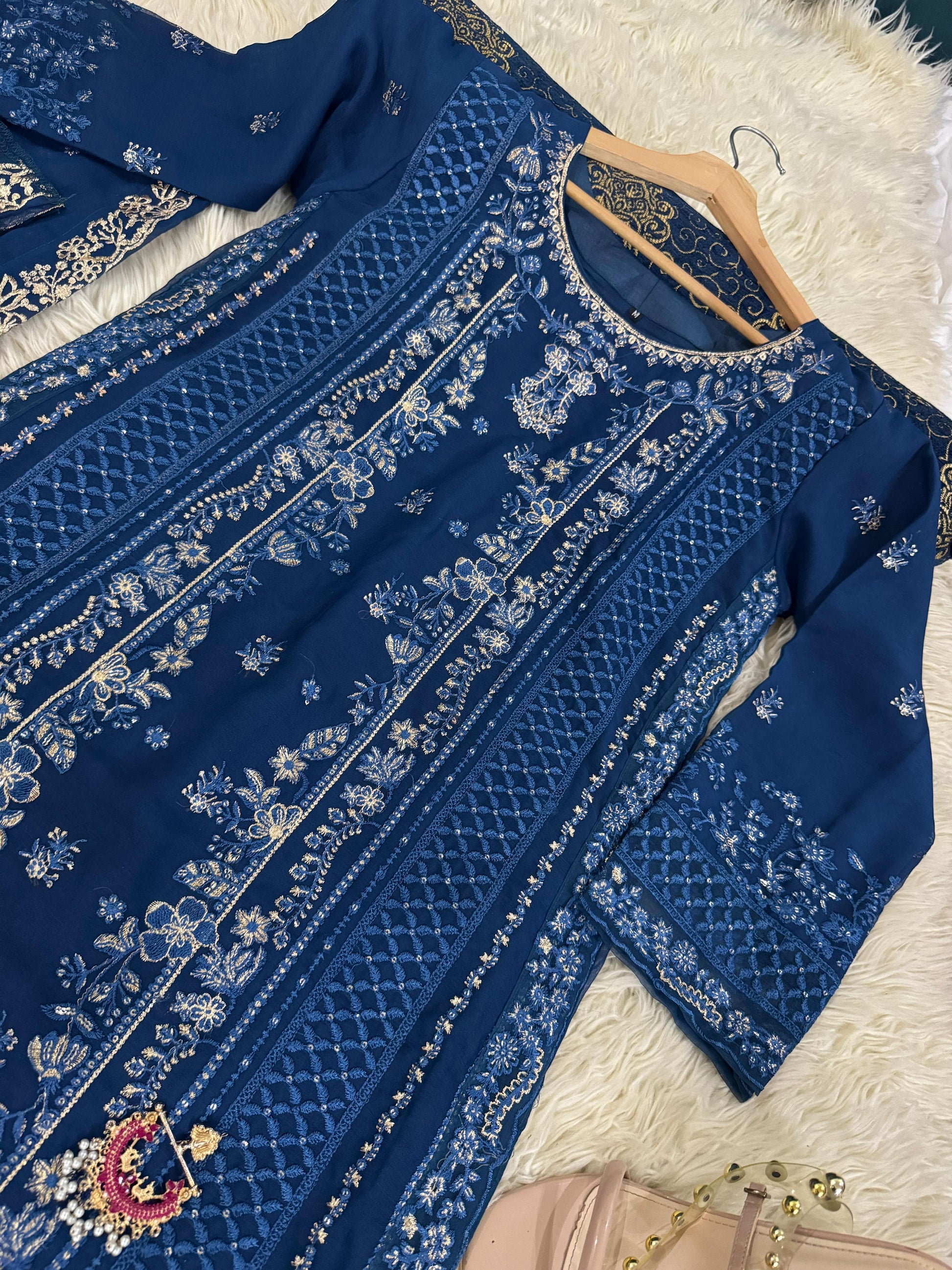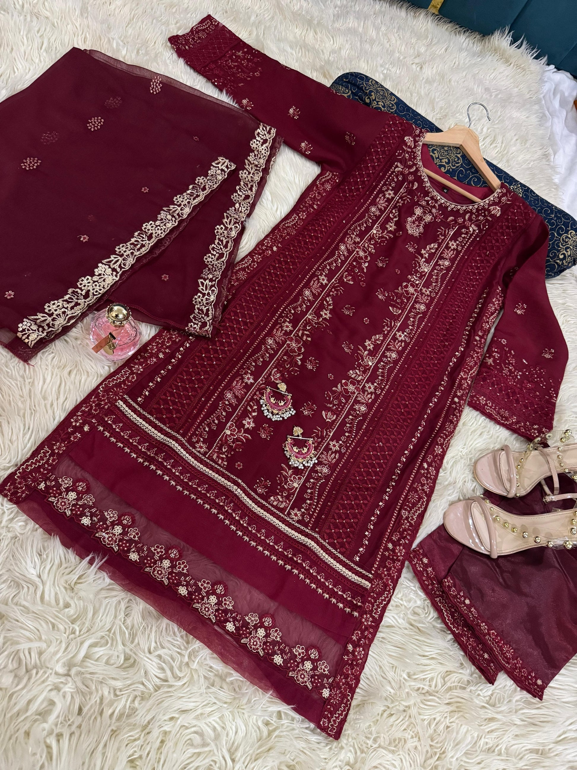 Introducing JAHAAN, the ultimate addition to your wardrobe. Made with the finest chiffon fabric and beautifully embroidered, this outfit exudes elegance and sophistication. Complete your look with the delicate chiffon dupatta and luxurious silk pants. Perfect for any occasion, experience the perfect blend of comfort and style with #eidpret and #newarrivle.