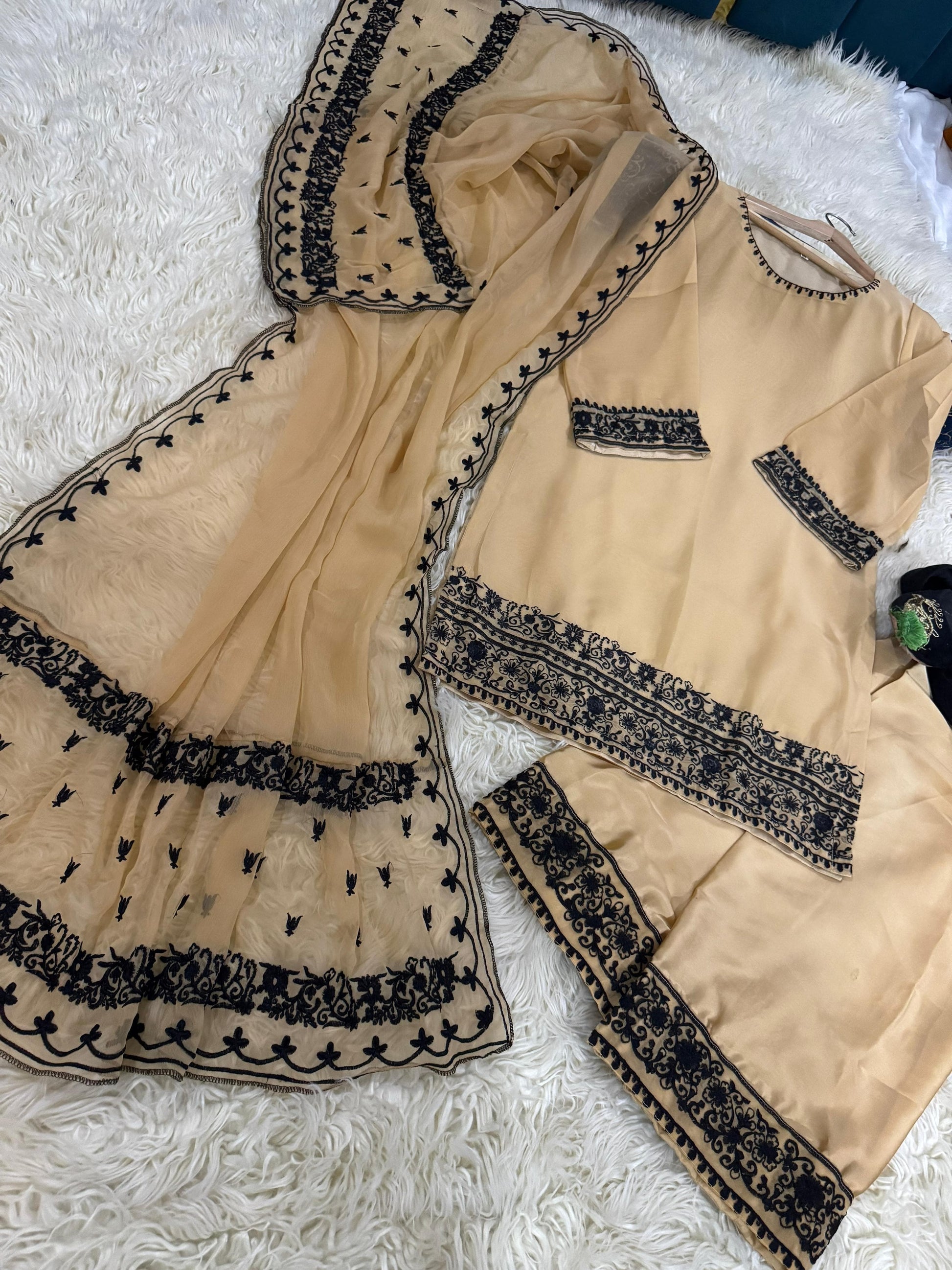 Introducing MAYAL, a stunning 3-piece set perfect for Eid! Made with high-quality chiffon and featuring intricate lace and embroidery work, this set includes a chiffon shirt, dupatta with cut work embroidery, and a stylish shamooz silk plazo. Elevate your wardrobe with this elegant and stylish ensemble.