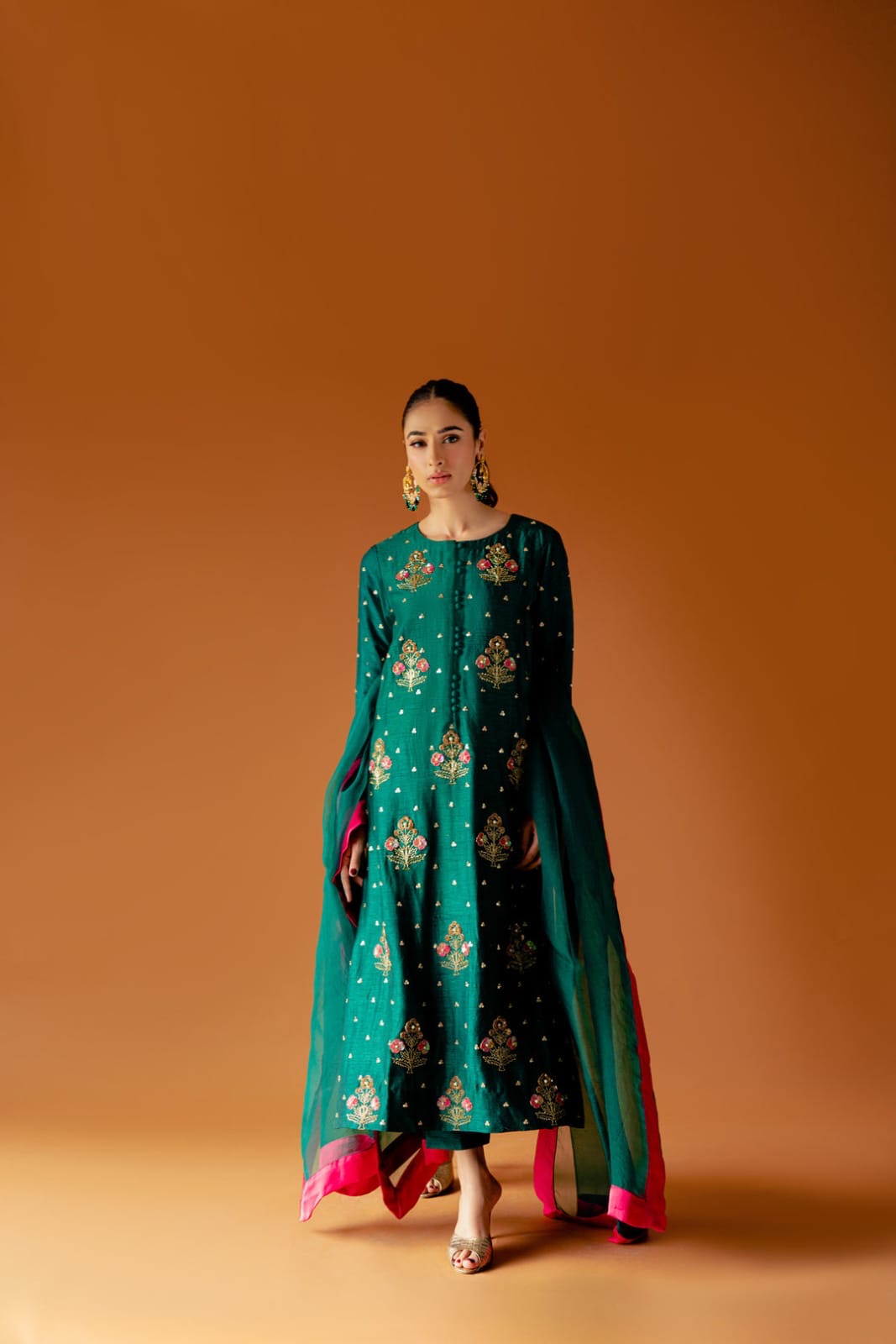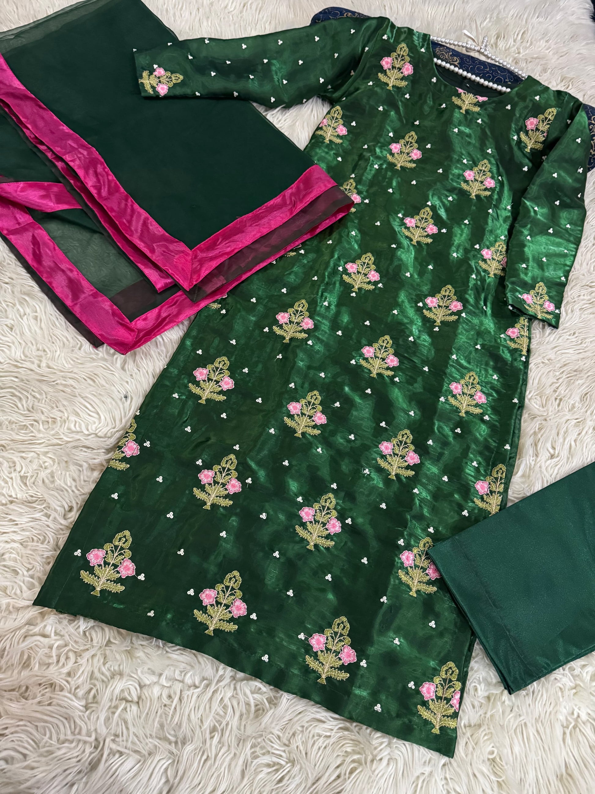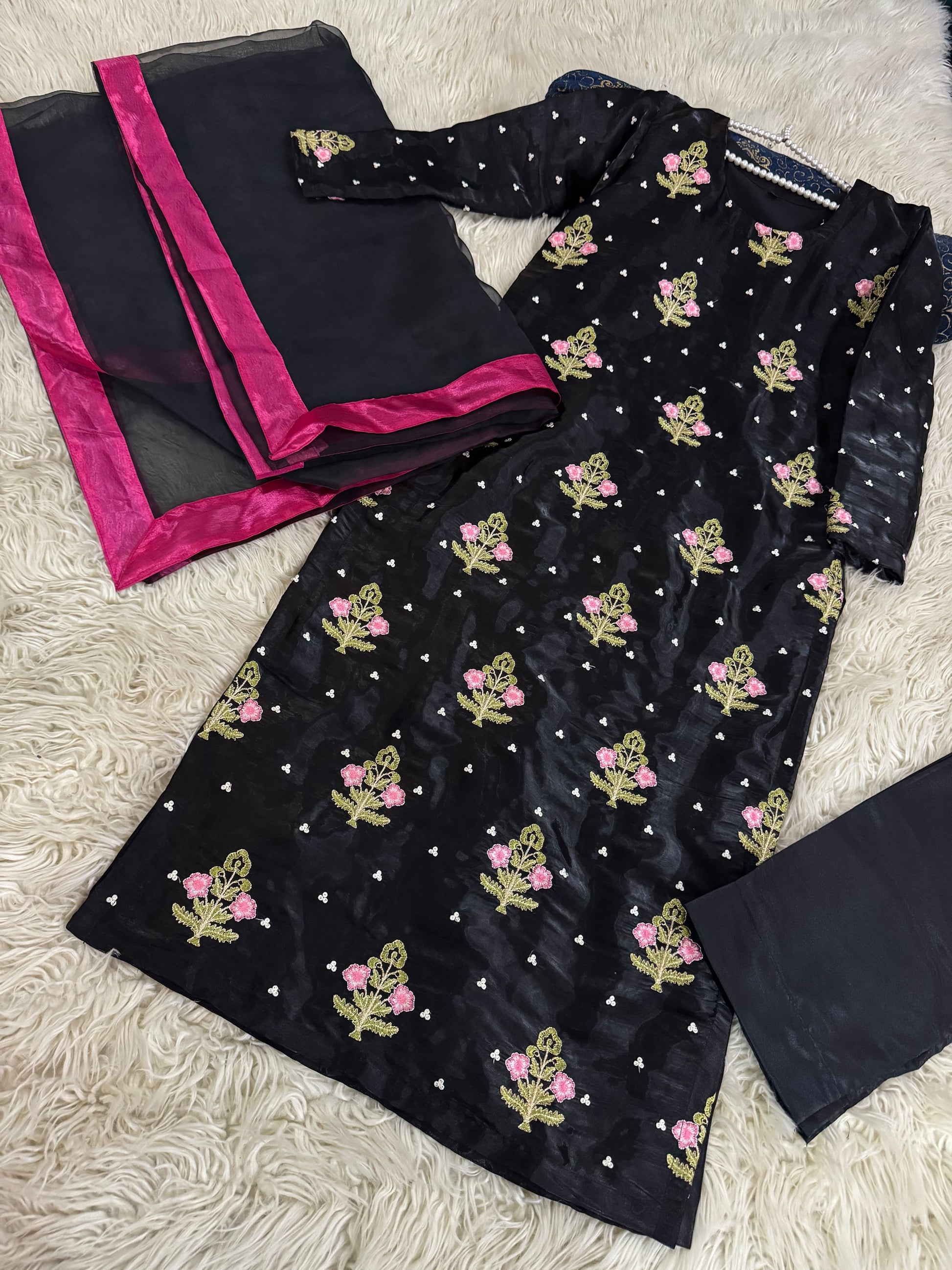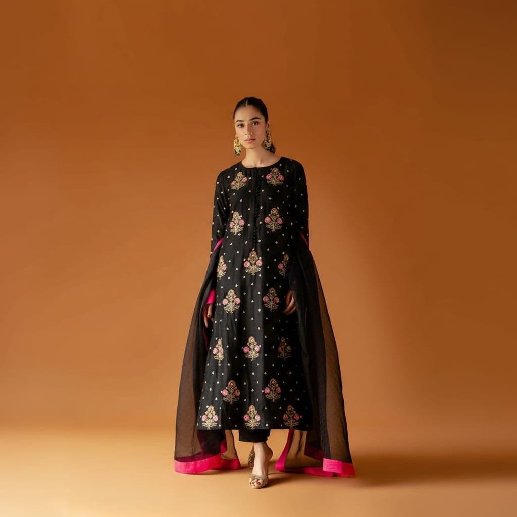 Elevate your style with KAIDA - the perfect combination of elegance and comfort. Made with pure Shesha silk, this set includes a stylish shirt with a trendy shalwar and a beautiful organza dupatta (3 yards). Add the #eidpret and #newarrivle to your wardrobe for a stunning new look.
