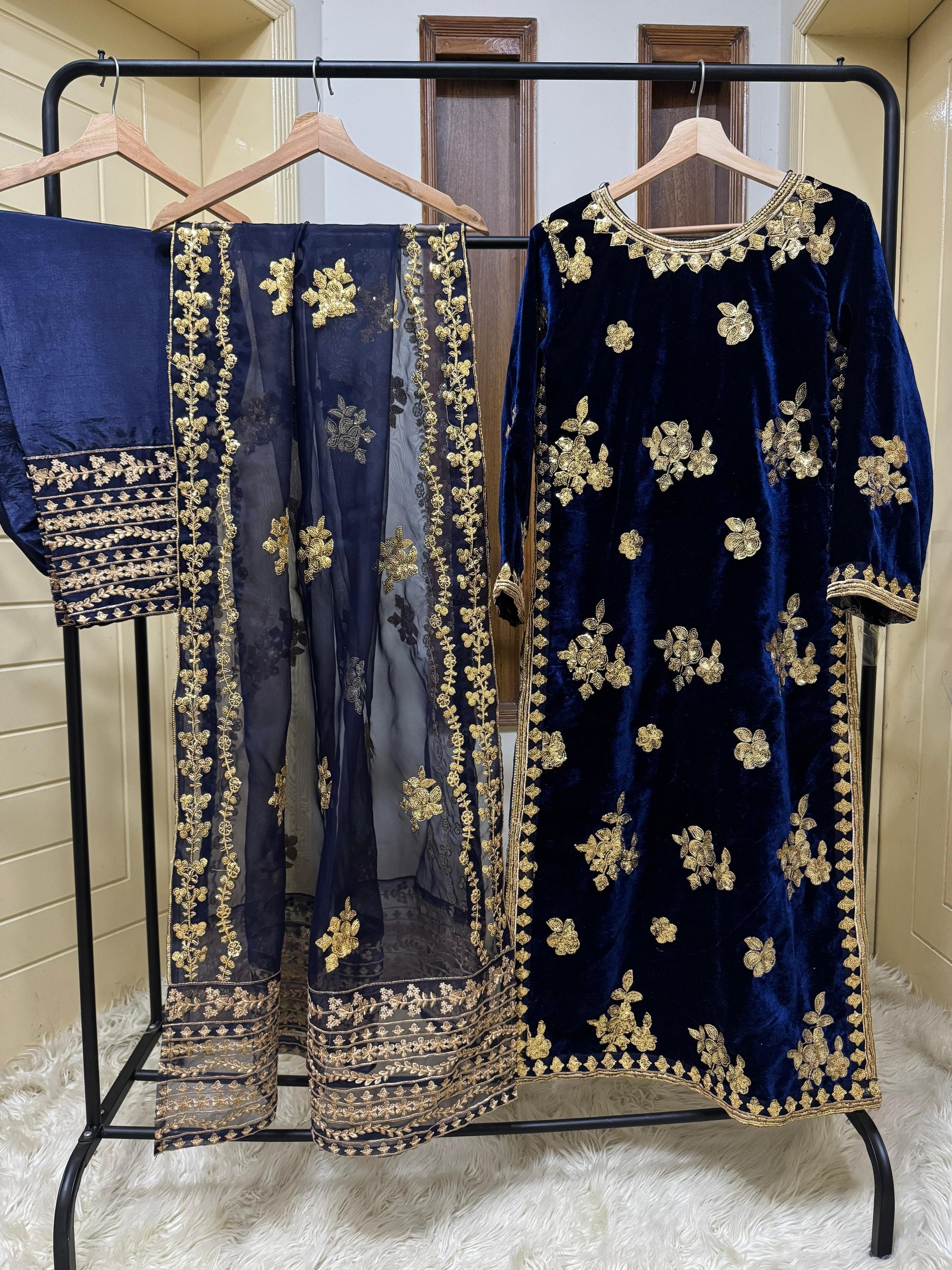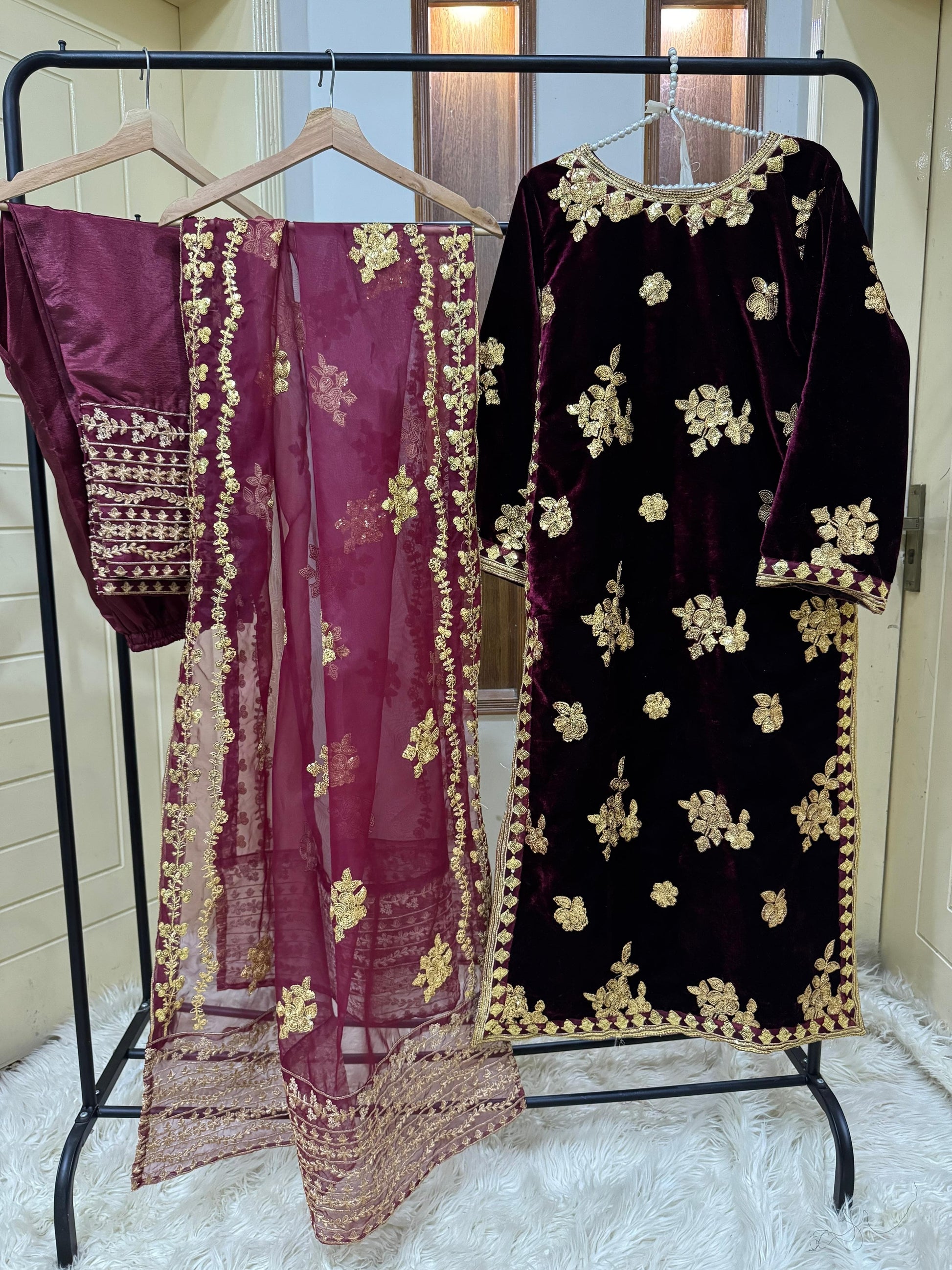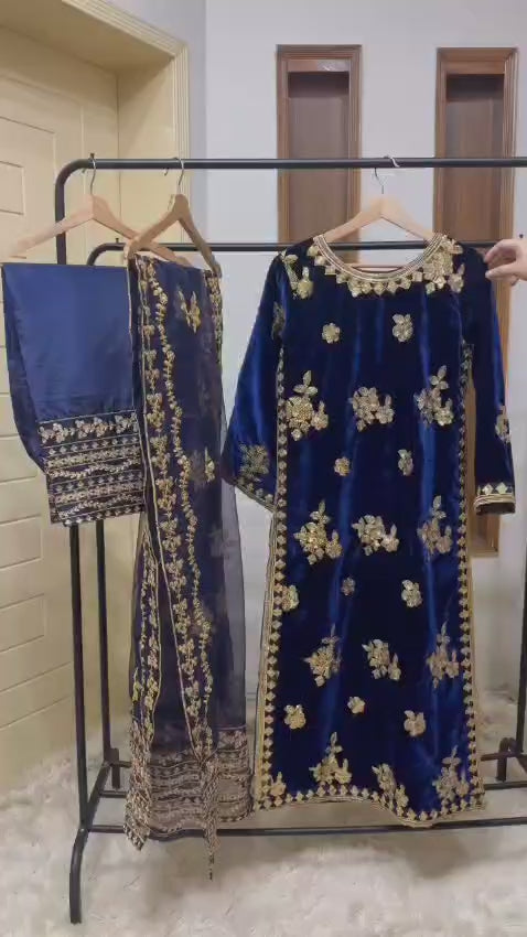 Elevate your look with Maaheeyy - the perfect blend of elegant pearl work, intricate Tilla embroidery, and luxurious Valvet fabric. The long length shirt and Valvet trouser add sophistication, while the 4-sided embroidered Organza adds a touch of opulence. Make a statement with 9k of timeless style.