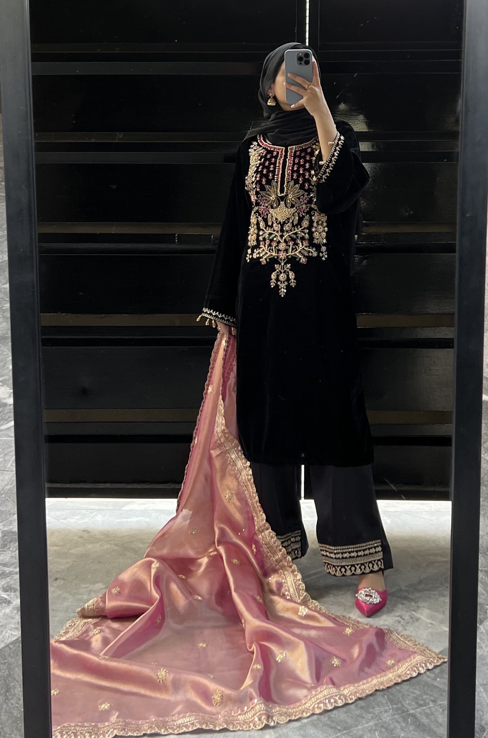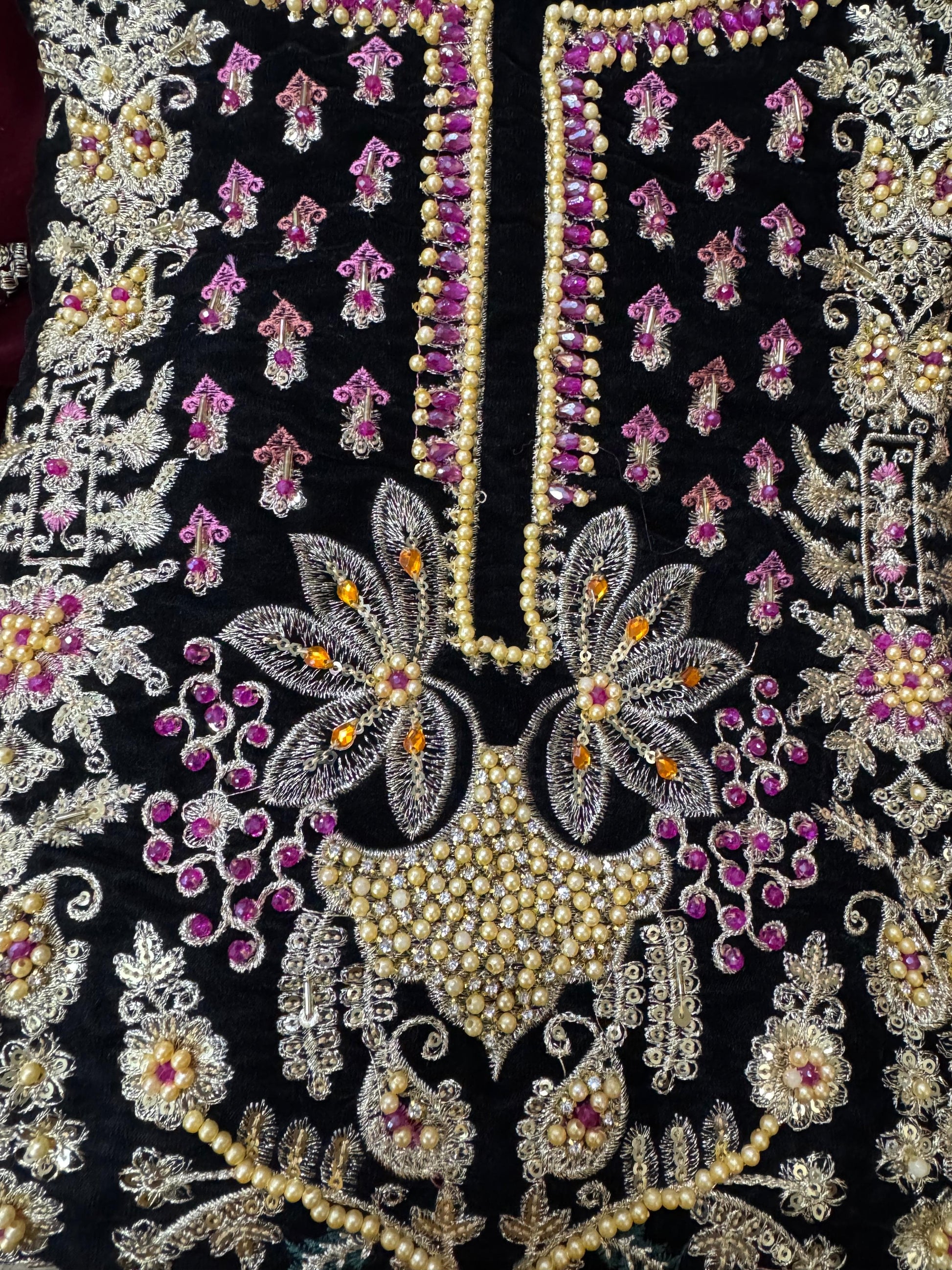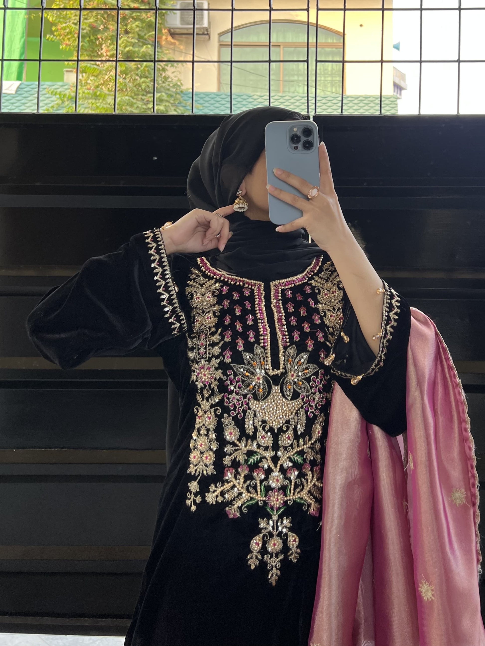 Elevate your look with Maaheeyy - the perfect blend of elegant pearl work, intricate Tilla embroidery, and luxurious Valvet fabric. The long length shirt and Valvet trouser add sophistication, while the 4-sided embroidered Organza adds a touch of opulence. Make a statement with 9k of timeless style.
