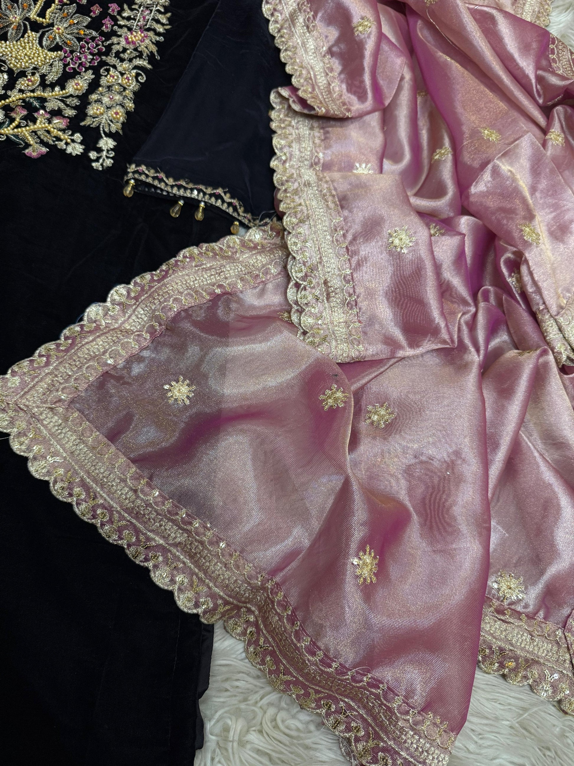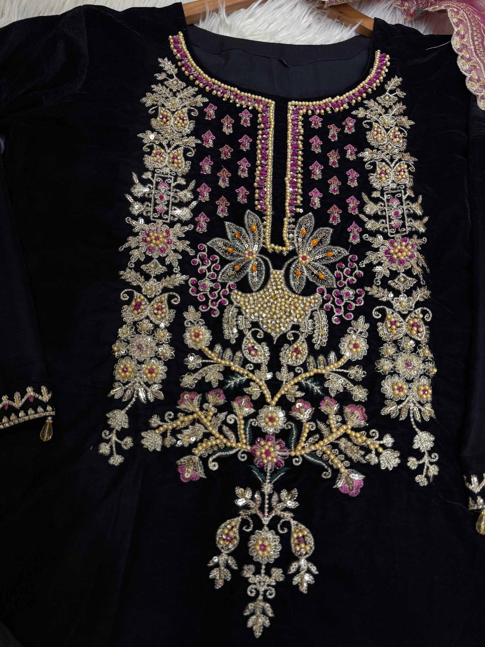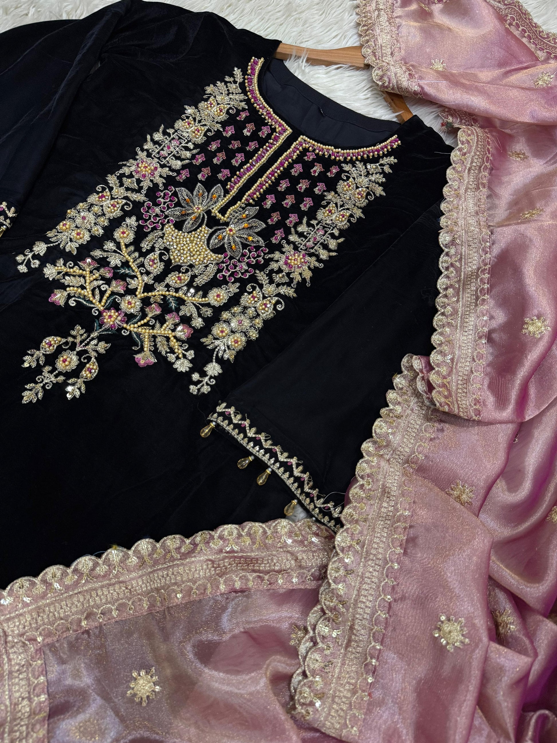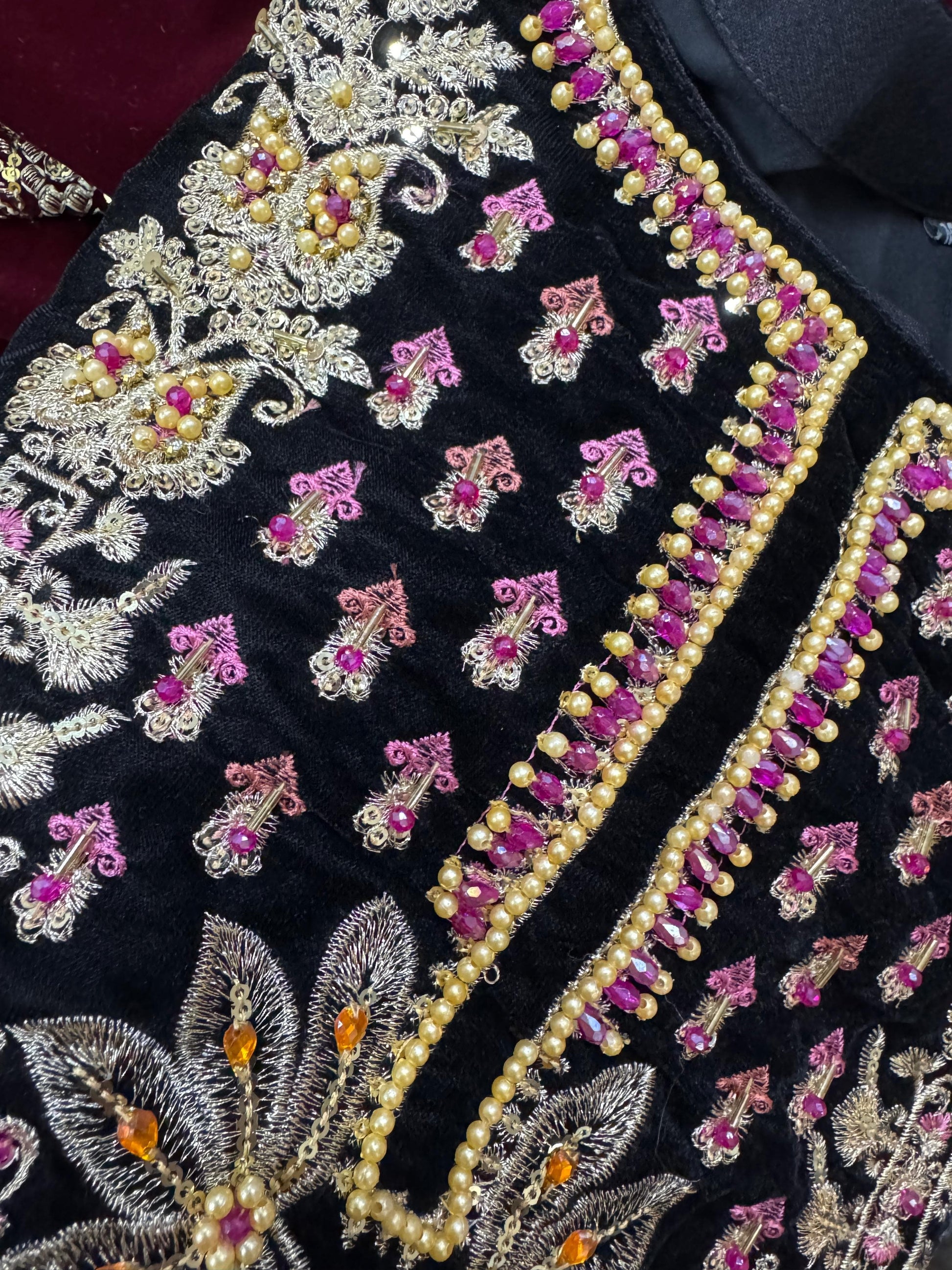 Elevate your look with Maaheeyy - the perfect blend of elegant pearl work, intricate Tilla embroidery, and luxurious Valvet fabric. The long length shirt and Valvet trouser add sophistication, while the 4-sided embroidered Organza adds a touch of opulence. Make a statement with 9k of timeless style.