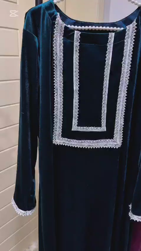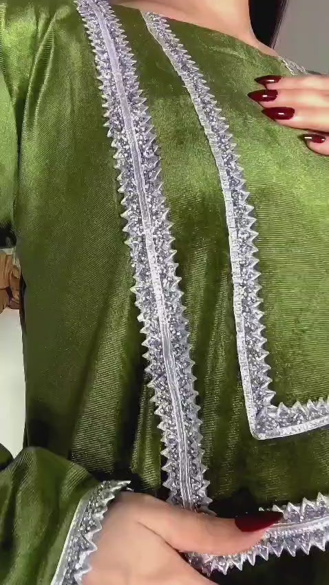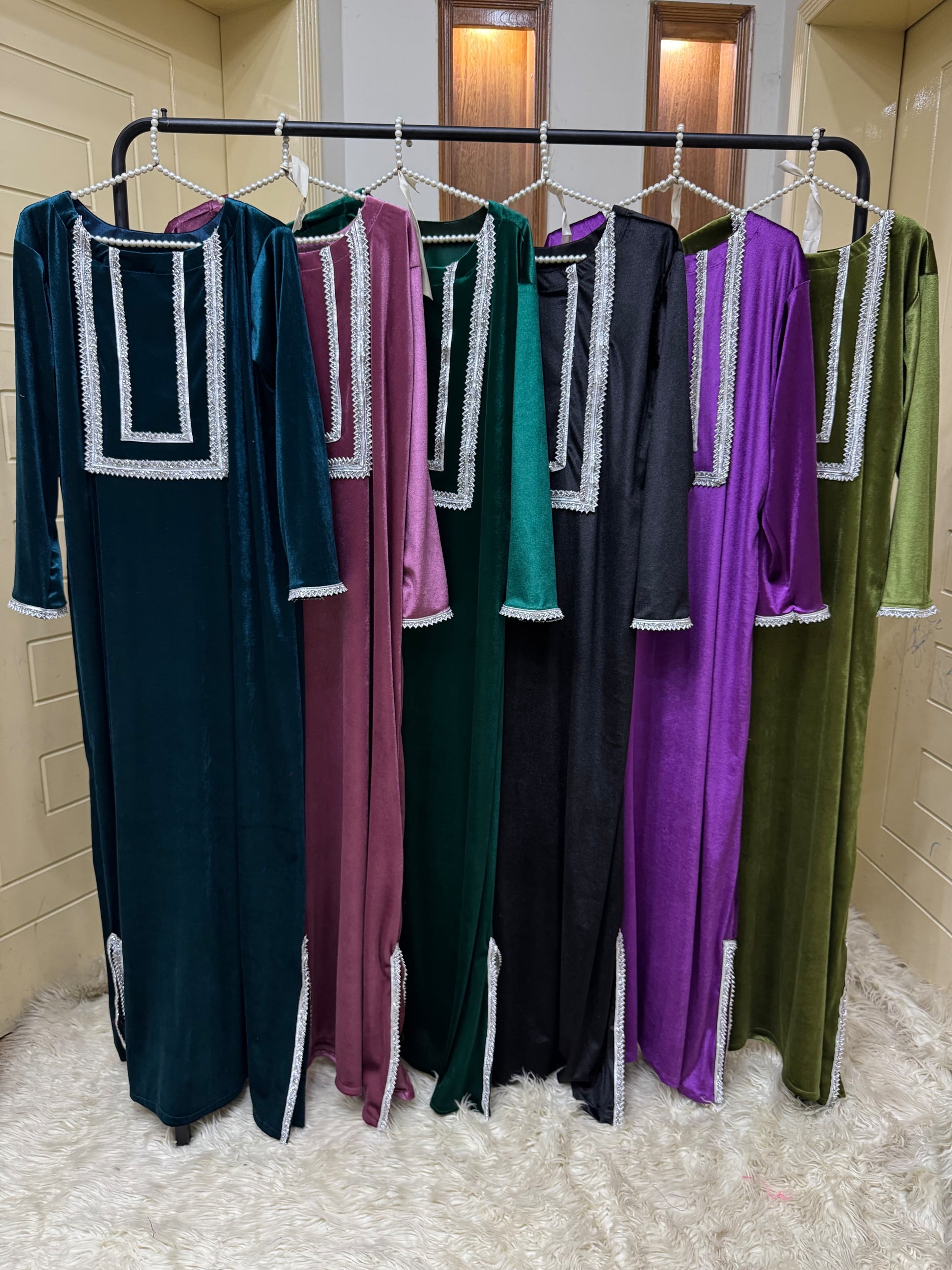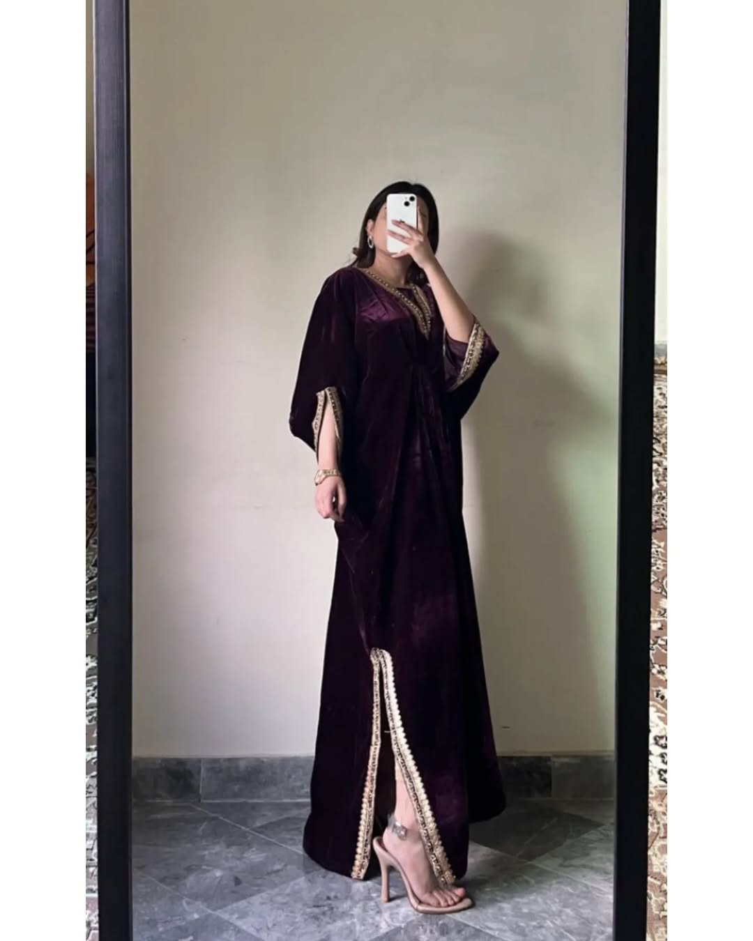 Discover the luxurious style of NOOR with our Kaftan, crafted from 9k micro velvet and adorned with exquisite embroidery. Elevate your wardrobe with the perfect blend of opulence and comfort.