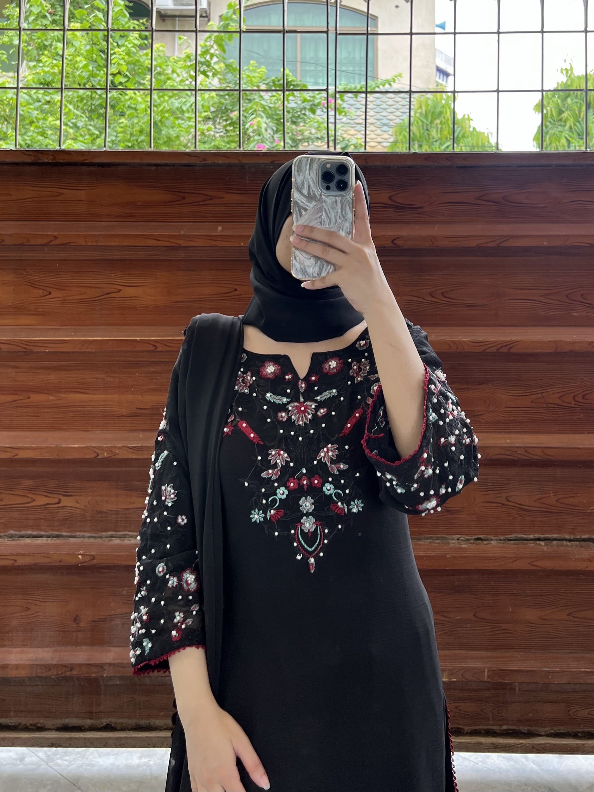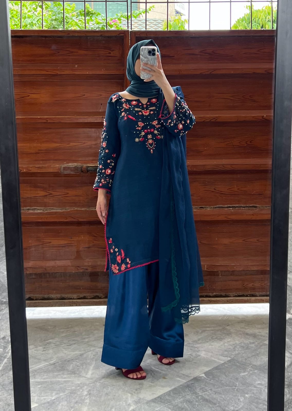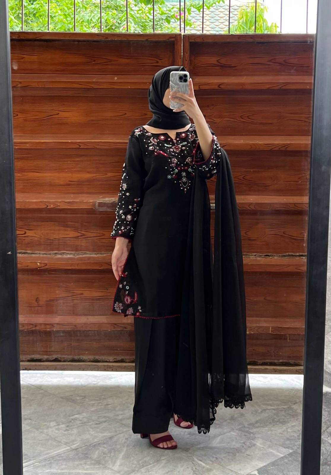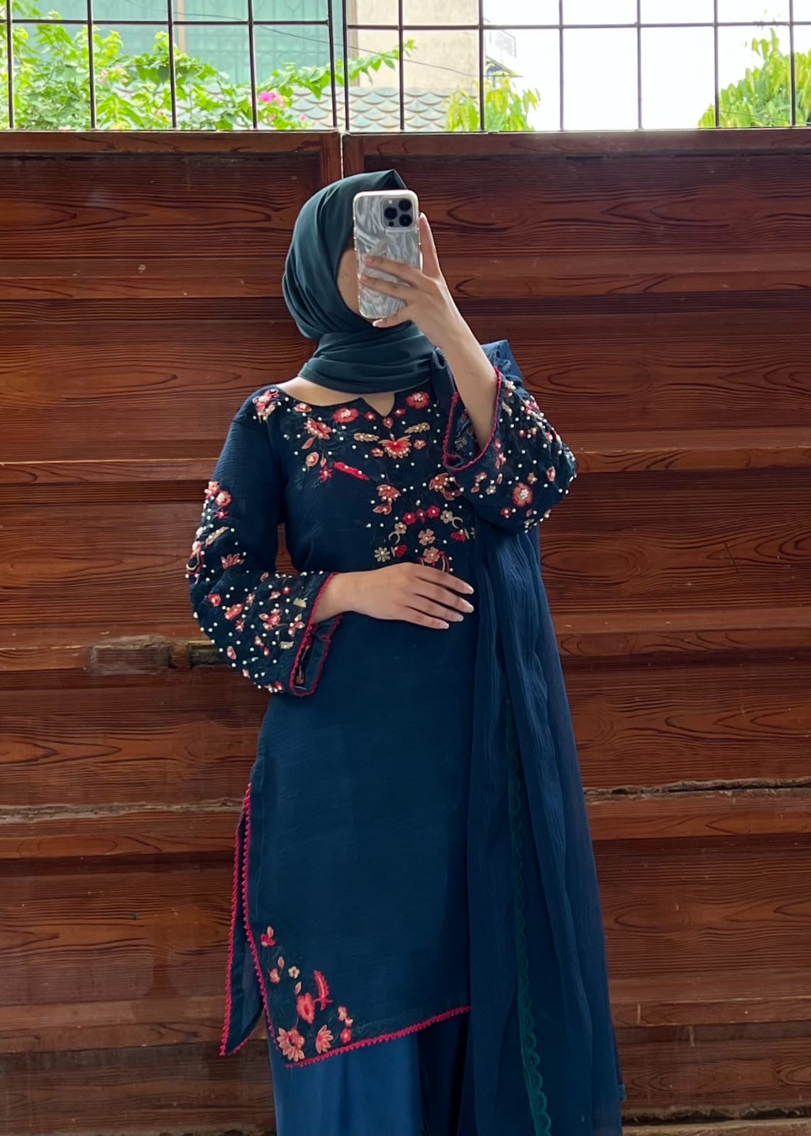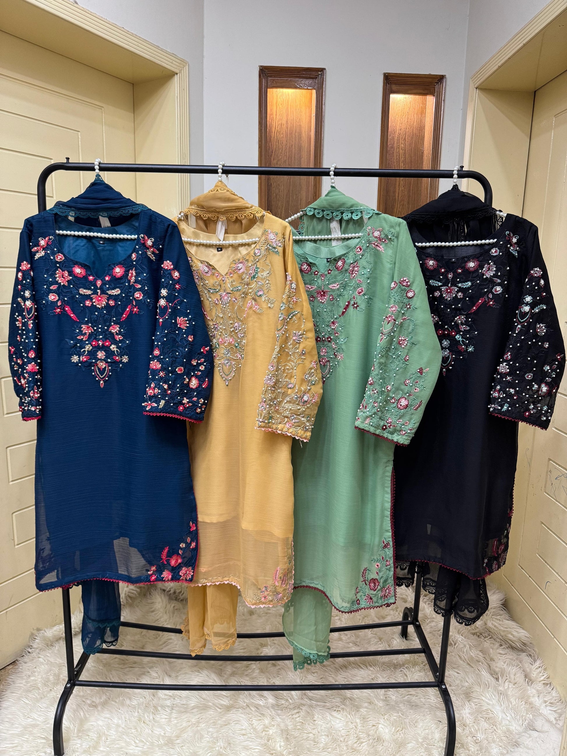 Introducing MAYAL, a stunning 3-piece set perfect for Eid! Made with high-quality chiffon and featuring intricate lace and embroidery work, this set includes a chiffon shirt, dupatta with cut work embroidery, and a stylish shamooz silk plazo. Elevate your wardrobe with this elegant and stylish ensemble.