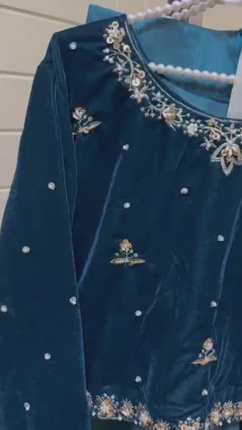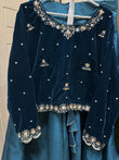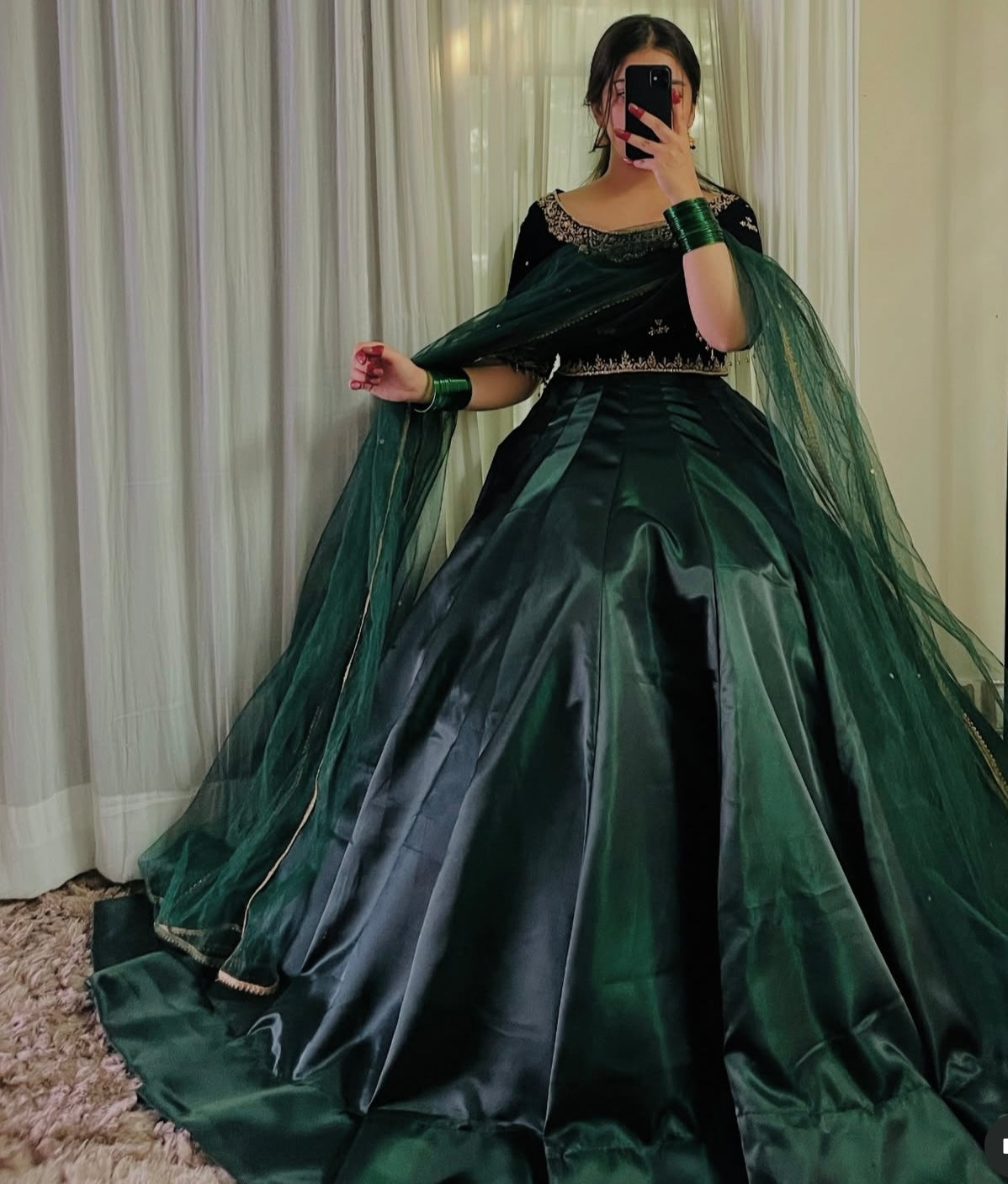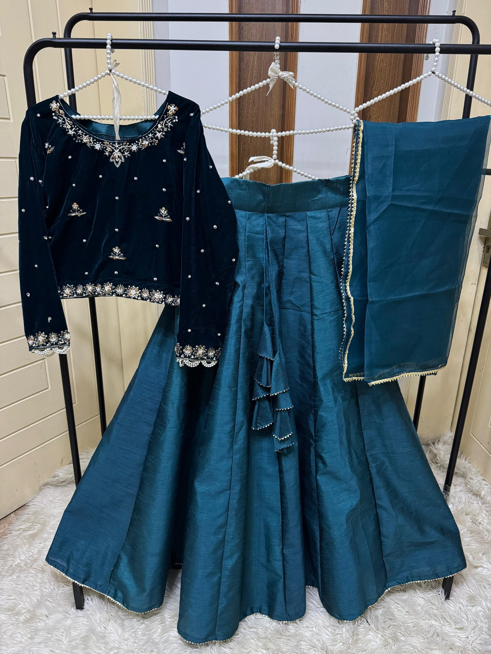 Experience elegance with the HALA lehnga choli set crafted from pure raw silk. The handmade Tilla embroidered choli features delicate lining and adjustable hooks for a perfect fit across sizes S (19" chest), M (21"), and L (23"). The lehnga is adorned with beautiful tassels and gotta lace, offering a 200-flair and a length of around 47-48 inches. Completing the ensemble is a 3-yard long organza dupatta embellished with matching gotta lace. This exquisite three-piece outfit blends traditional craftsmanship with contemporary style, ideal for weddings and festive occasions.