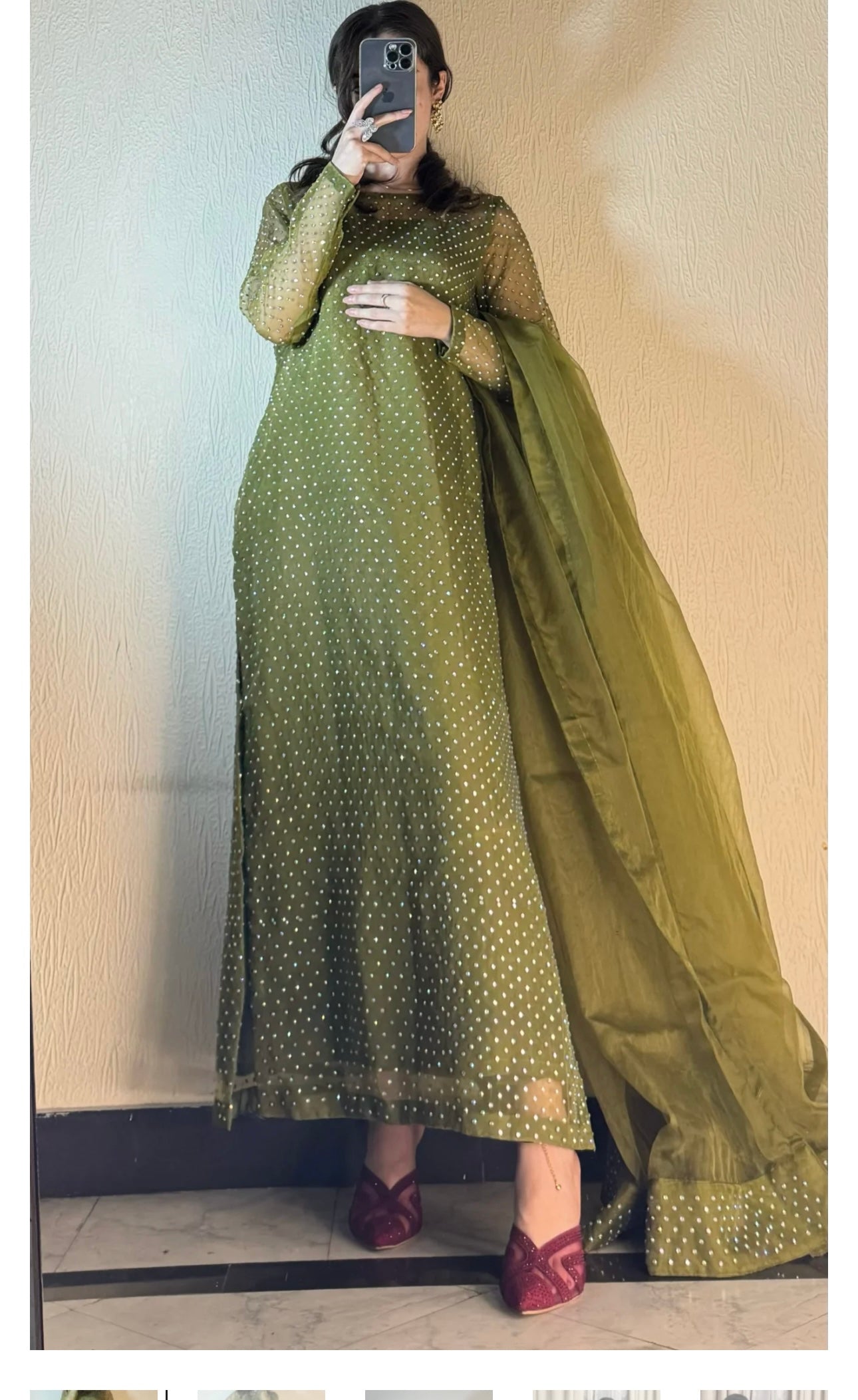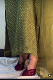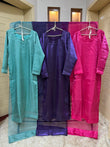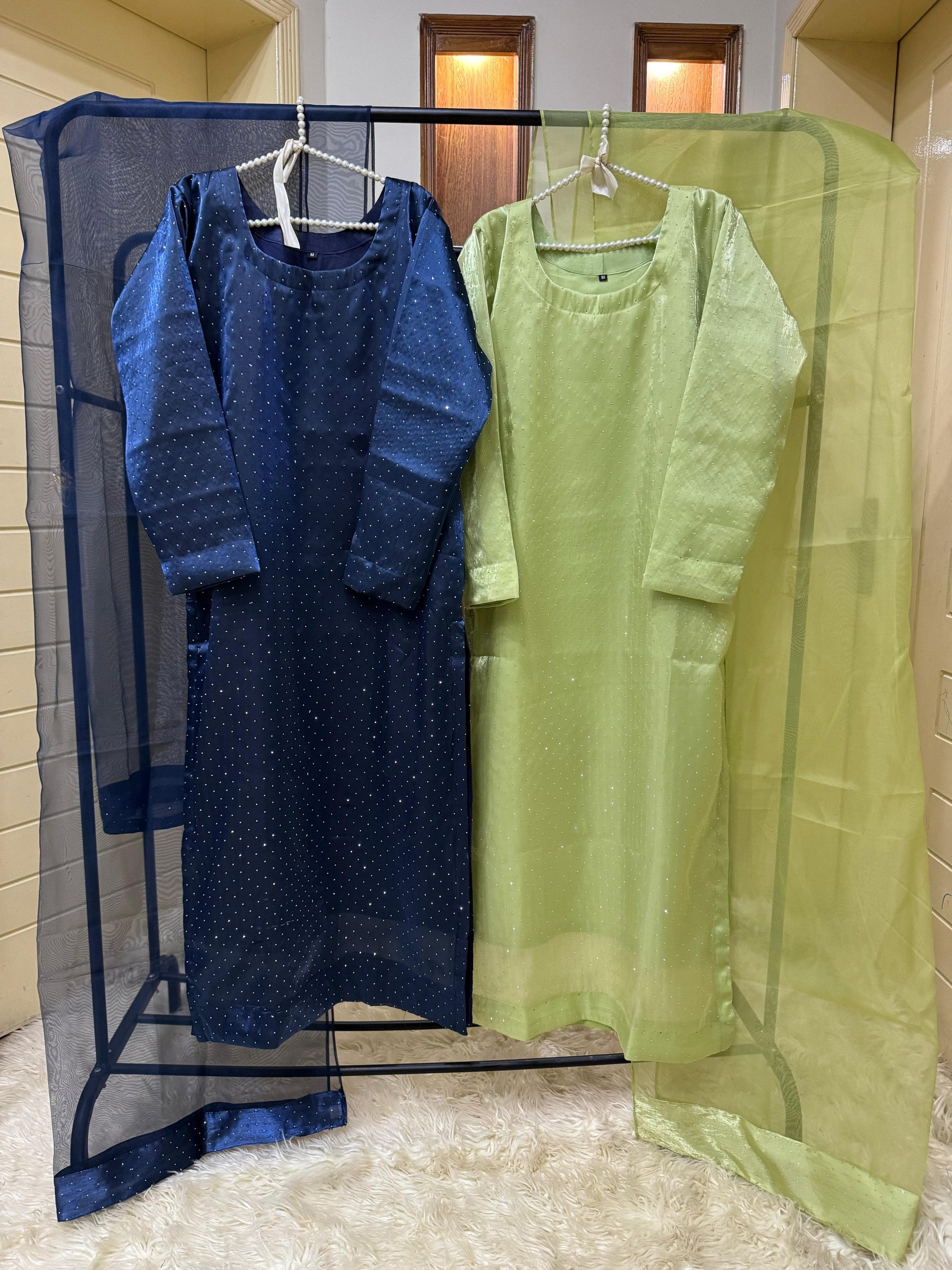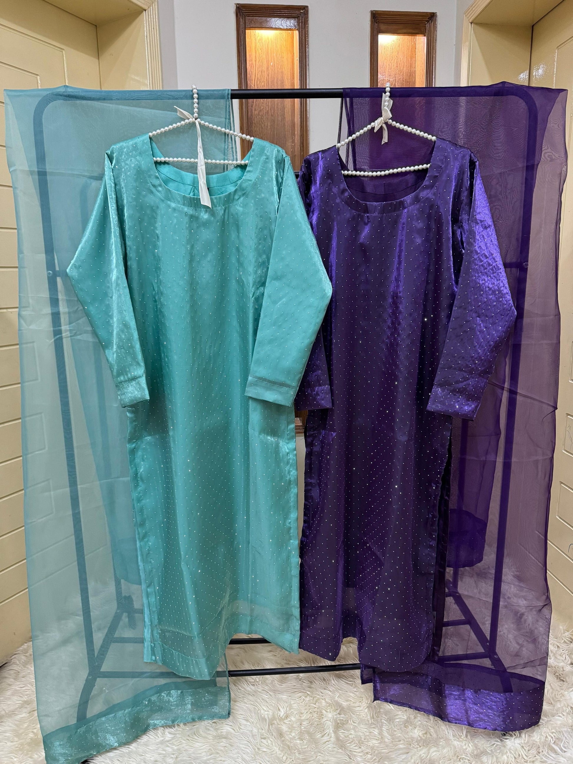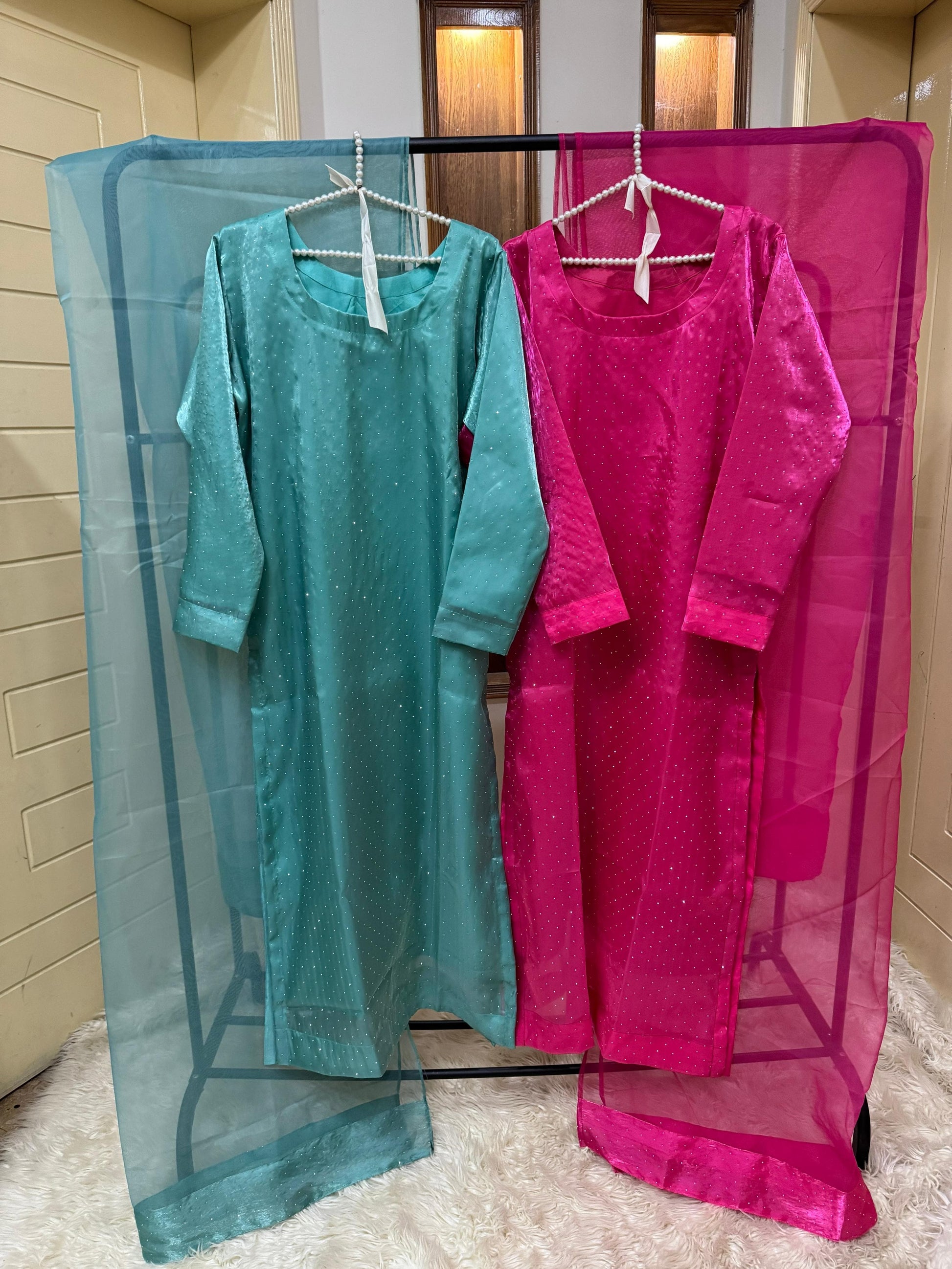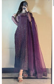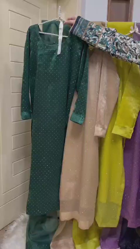 Experience elegance with the ROMAYEL 3-piece set, designed for standout party wear. The shisha silk shirt features intricate stonework, offering a sophisticated shimmer. Complemented by a long-length 3-yard organza dupatta, it adds graceful flow to your look. Paired with a silk pant for complete comfort and style. Available in sizes S (19" chest), M (21" chest), and L (23" chest) with a shirt length of 50 inches, this ensemble combines luxury fabric with expert craftsmanship for an unforgettable outfit.