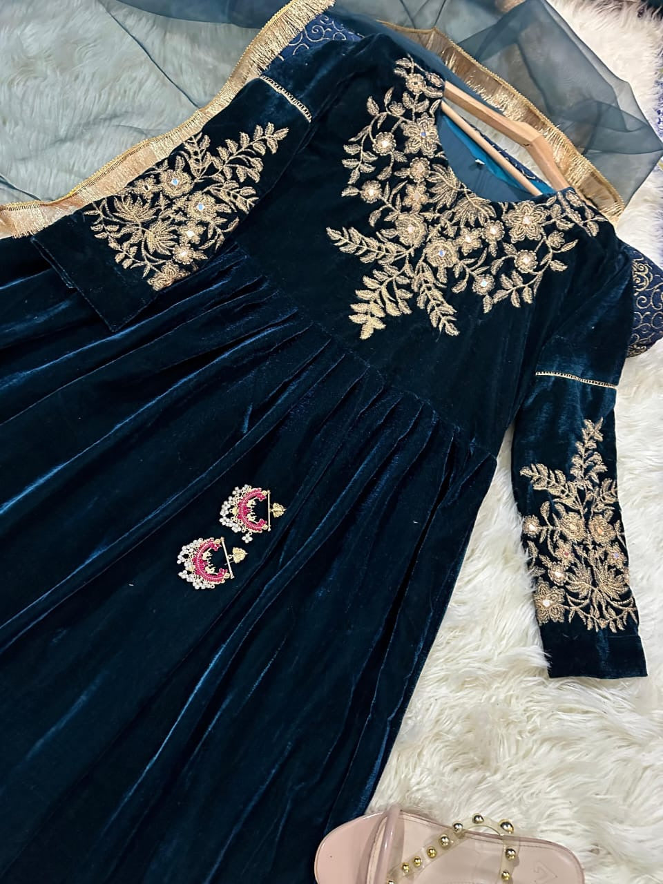 This valvet maxi features intricate mirror work and Tilla embroidery, adding a touch of luxury to your wardrobe. Made with high-quality valvet fabric, it is both comfortable and stylish. The organza dupatta completes the look. Upgrade your fashion game with this statement piece.