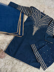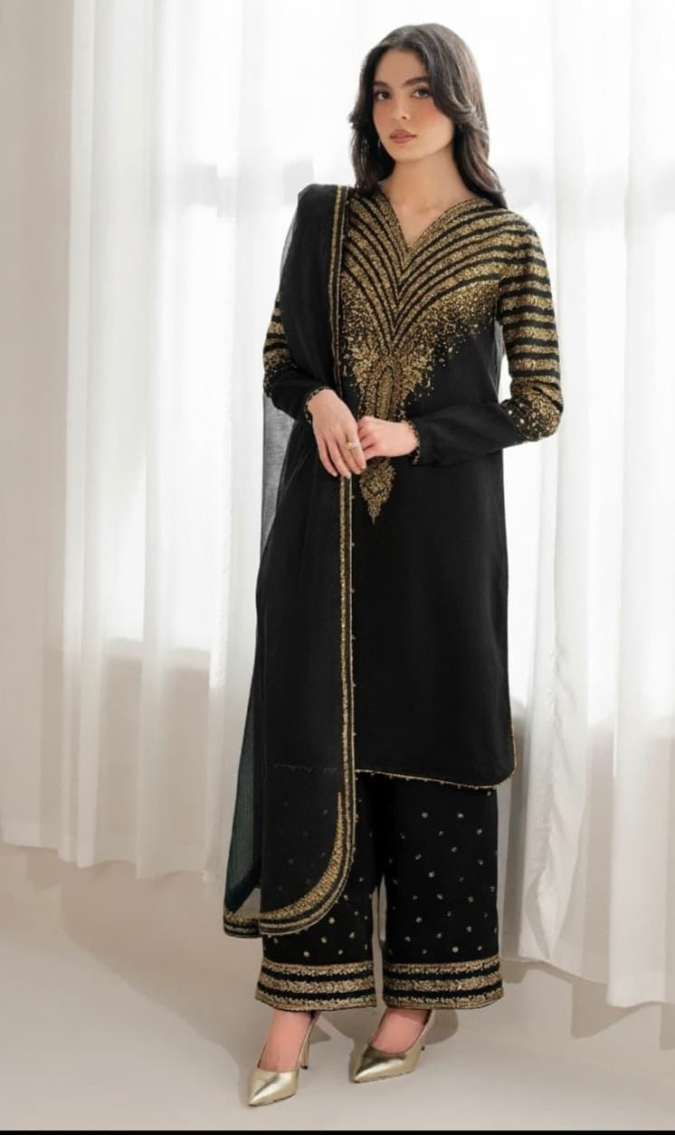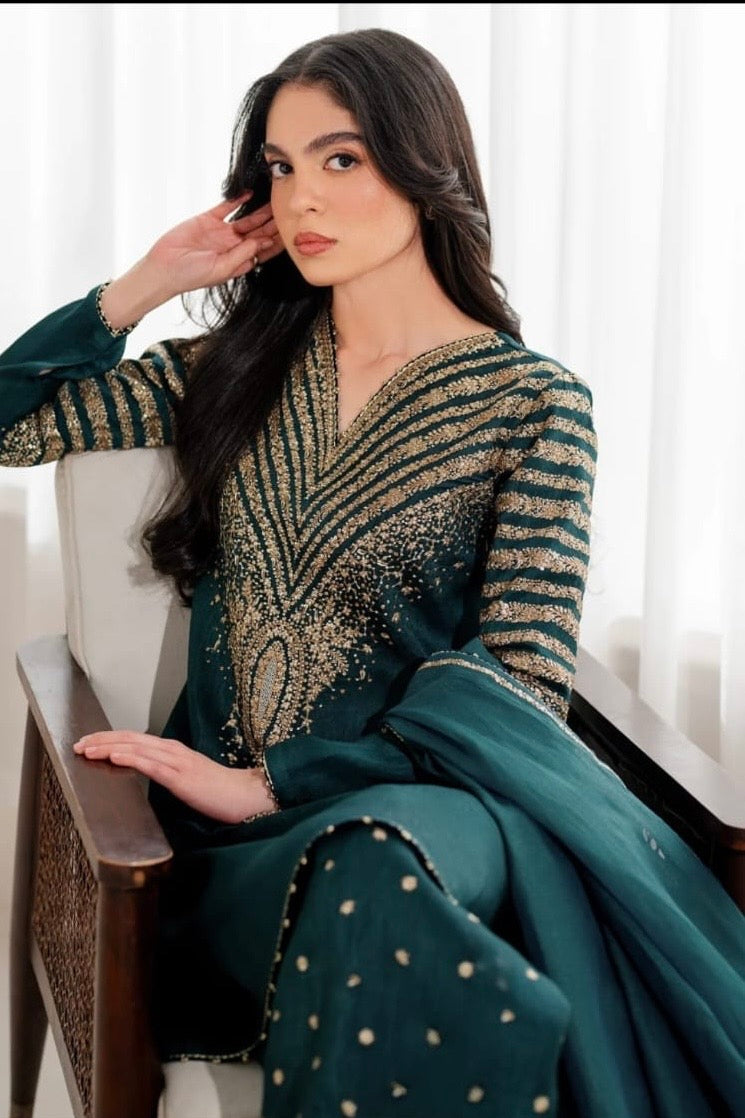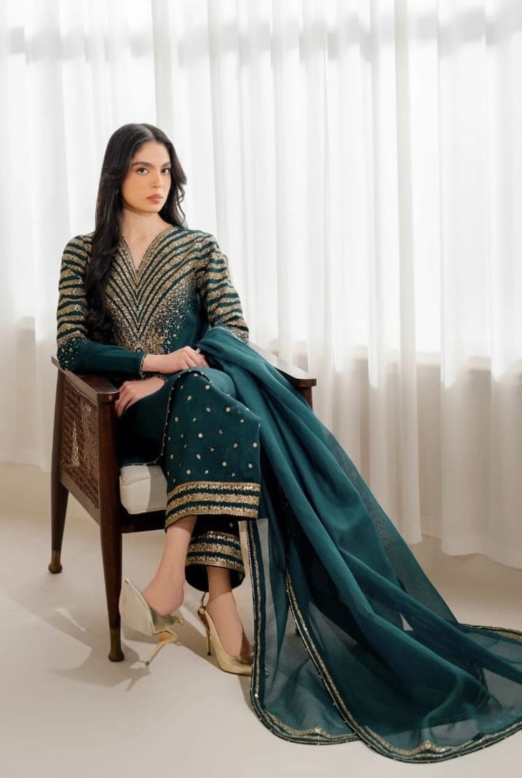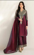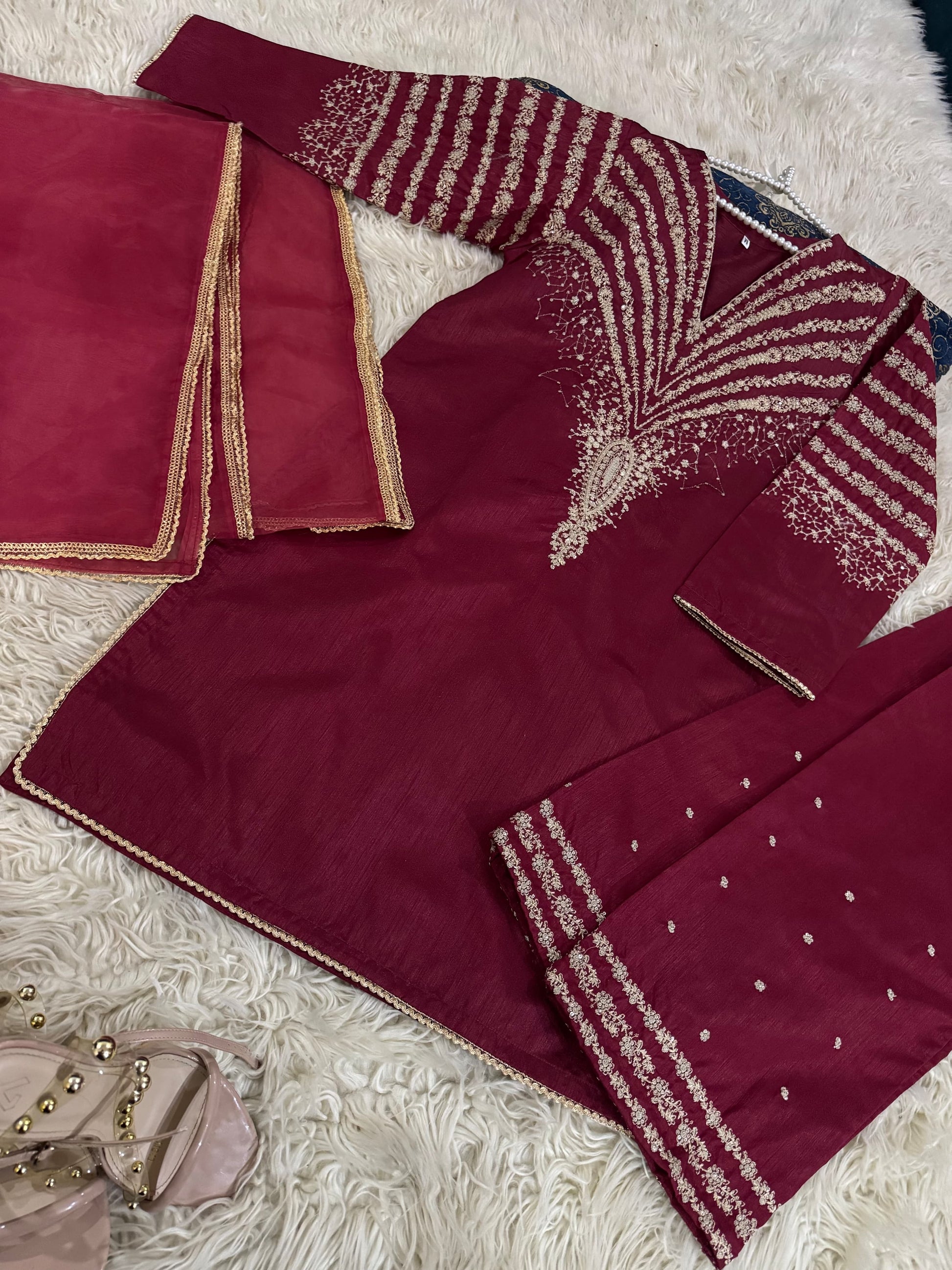Expertly crafted with heavy embroidery and delicate lace work, the RUSAIL Raw silk shirt boasts a long length design for a sophisticated look. The 4-sided embroidered organza dupatta adds an elegant touch, while the accompanying silk pants complete the ensemble. Elevate your wardrobe with RUSAIL's exquisite design.