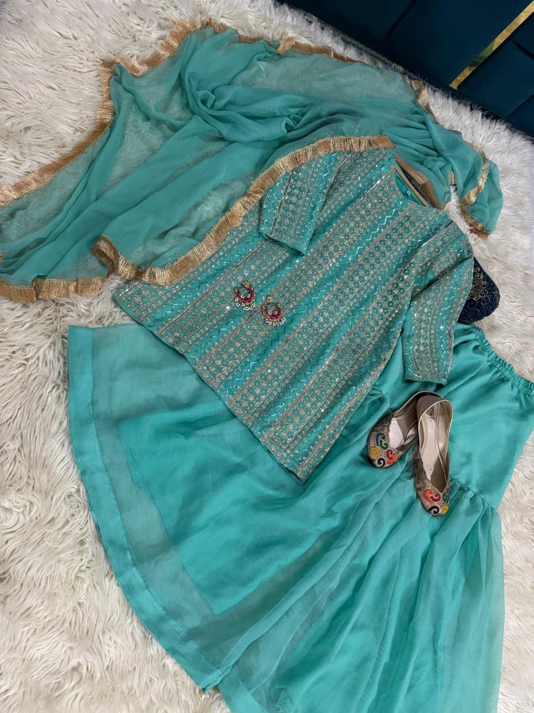 Expertly crafted, Dhanak effortlessly combines 9mm sequence work Chiffon fabric with a delicate Chiffon Gharara design. The inner is fully attached for ultimate comfort and style. Elegant and glamorous, Dhanak will make you feel like a true fashionista.