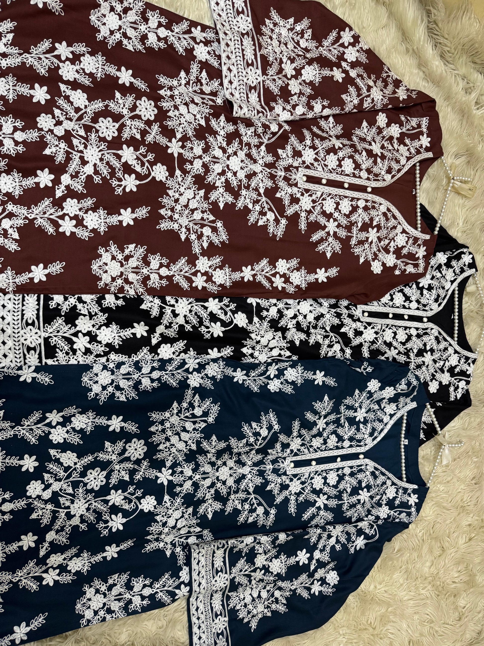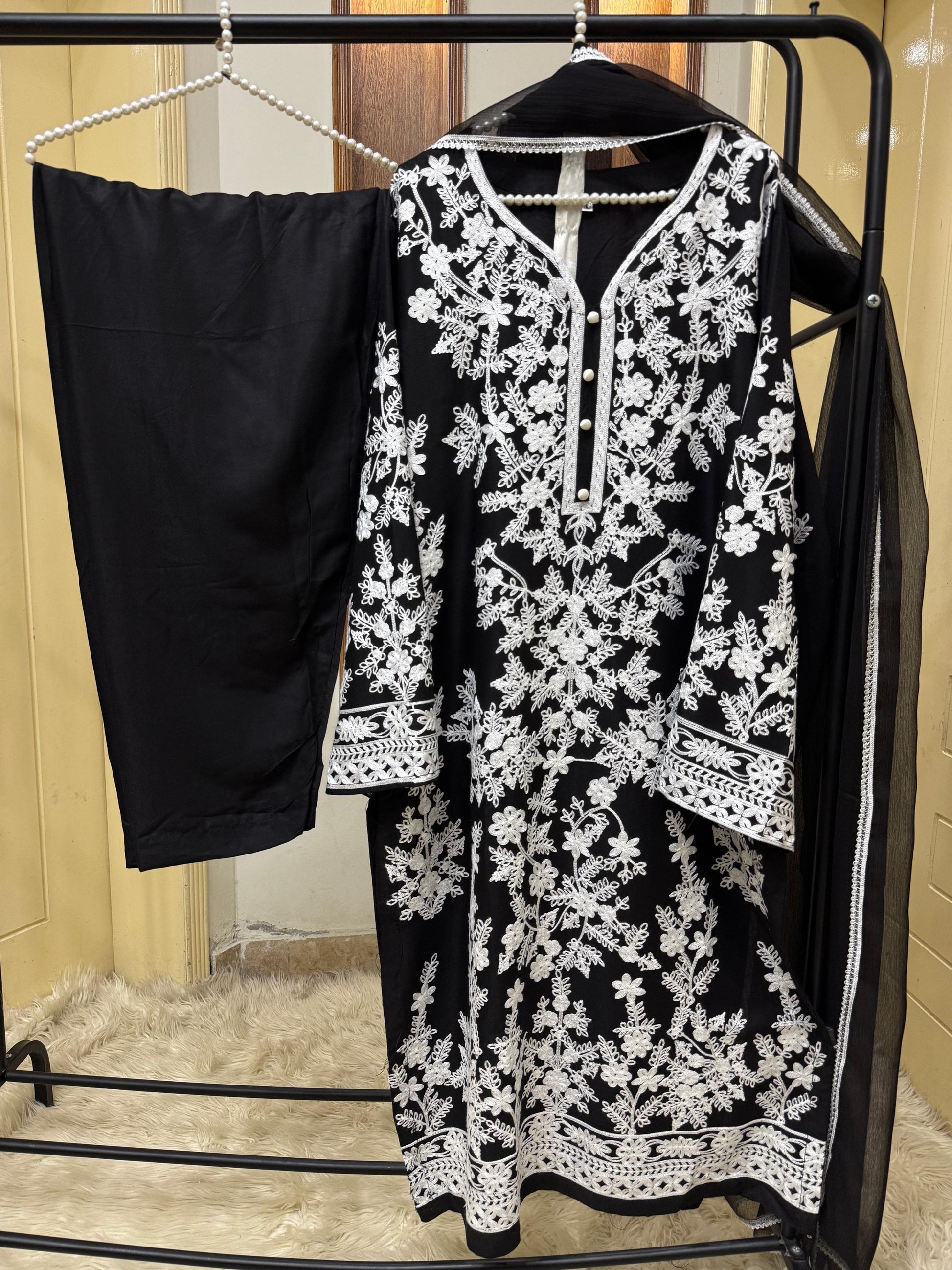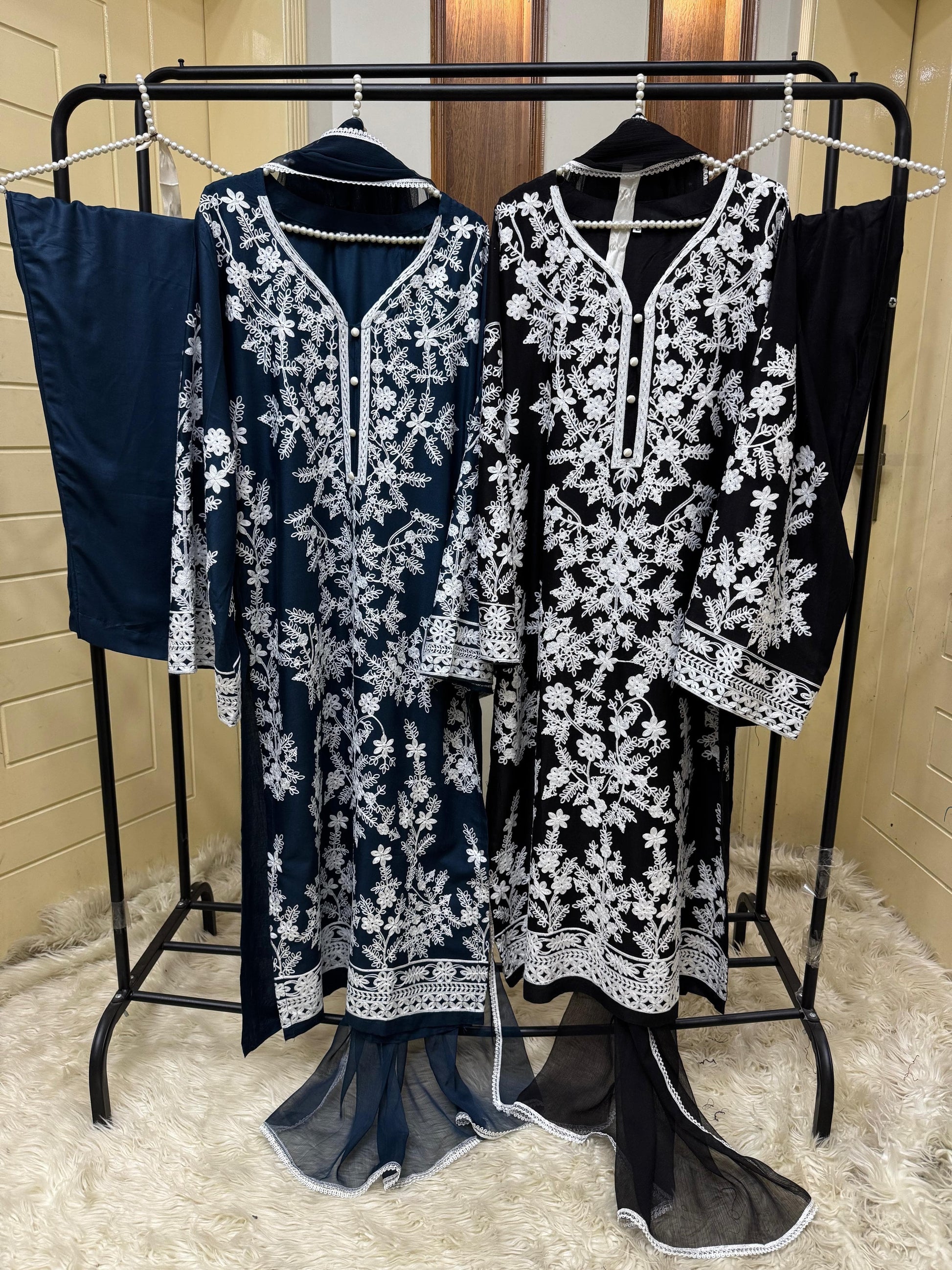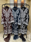 Introducing JASMINE, our luxurious Winter collection featuring 3pc causal wear. Keep warm with the winter stuff fabric from China, enhanced with elegant stone embroidery and delicate thready with tilla details. Elevate your style with this must-have for the season.