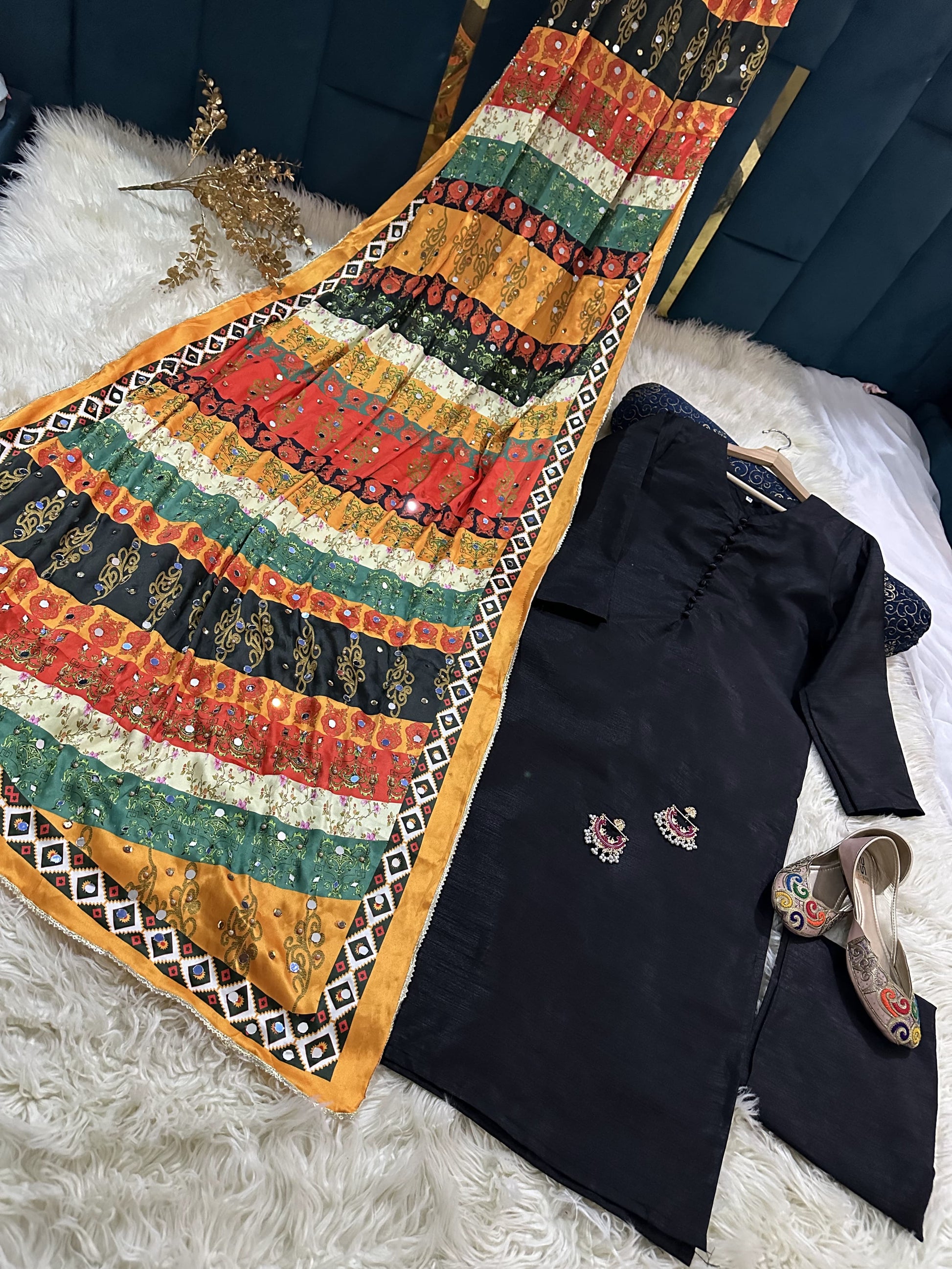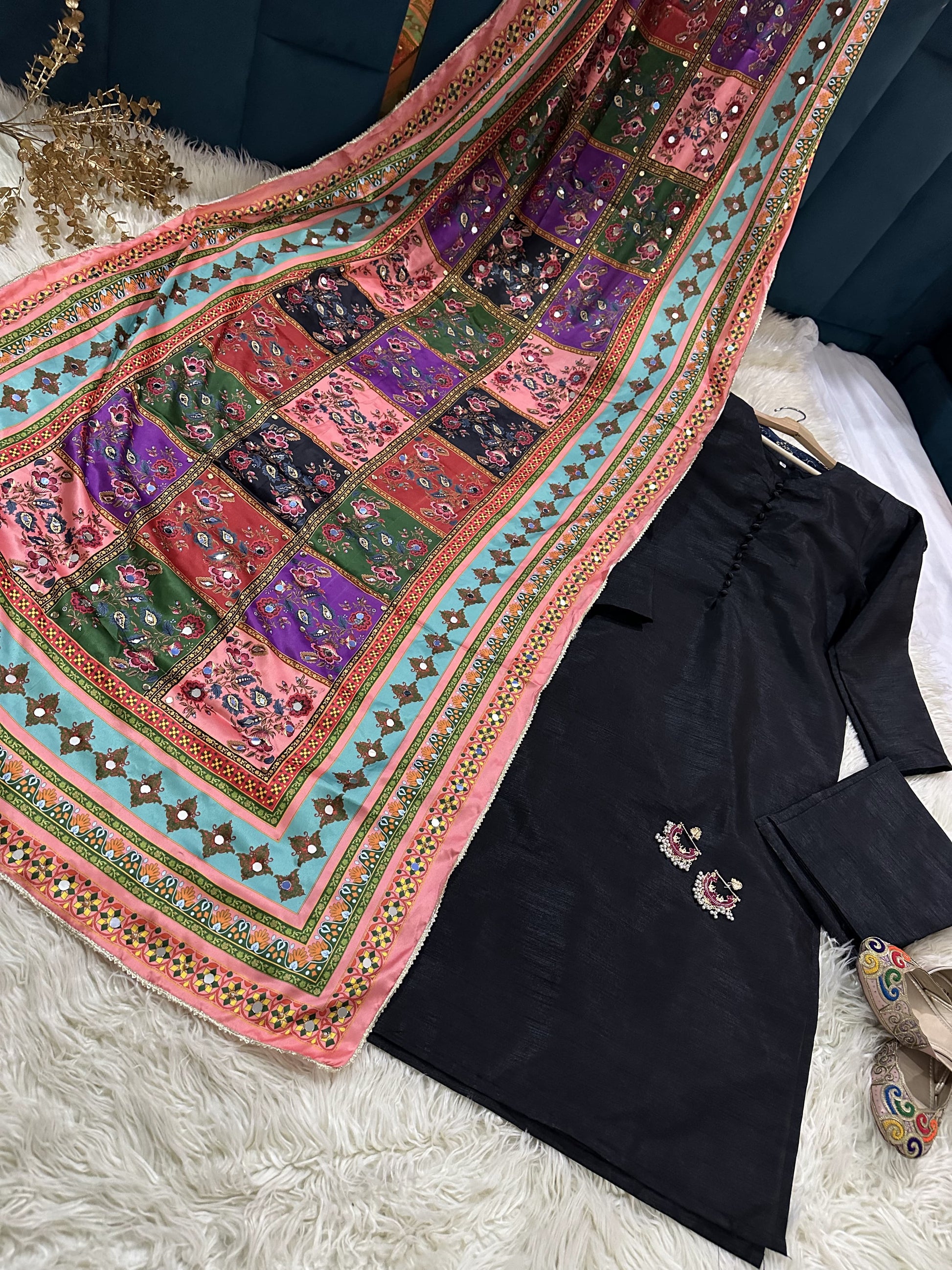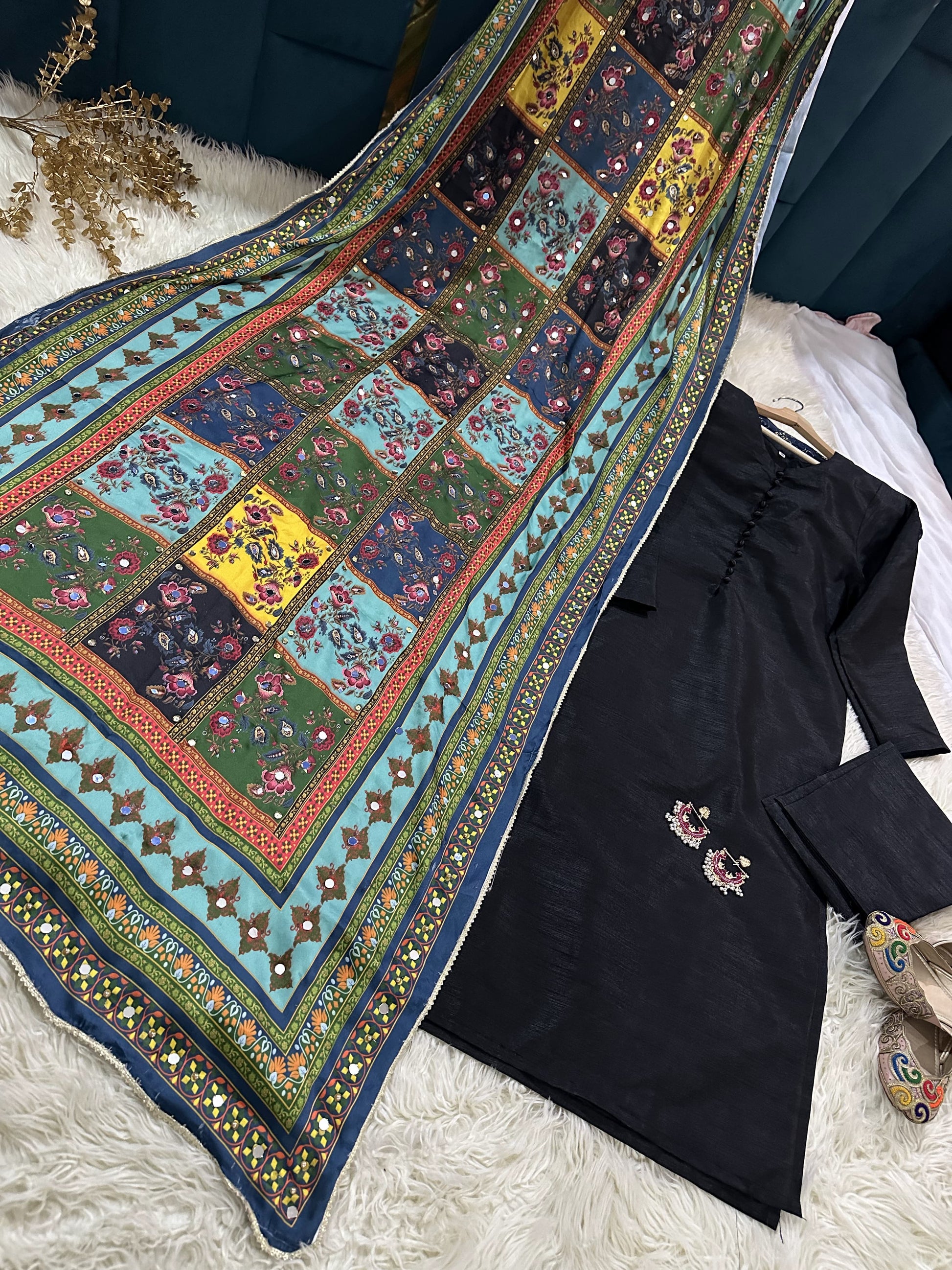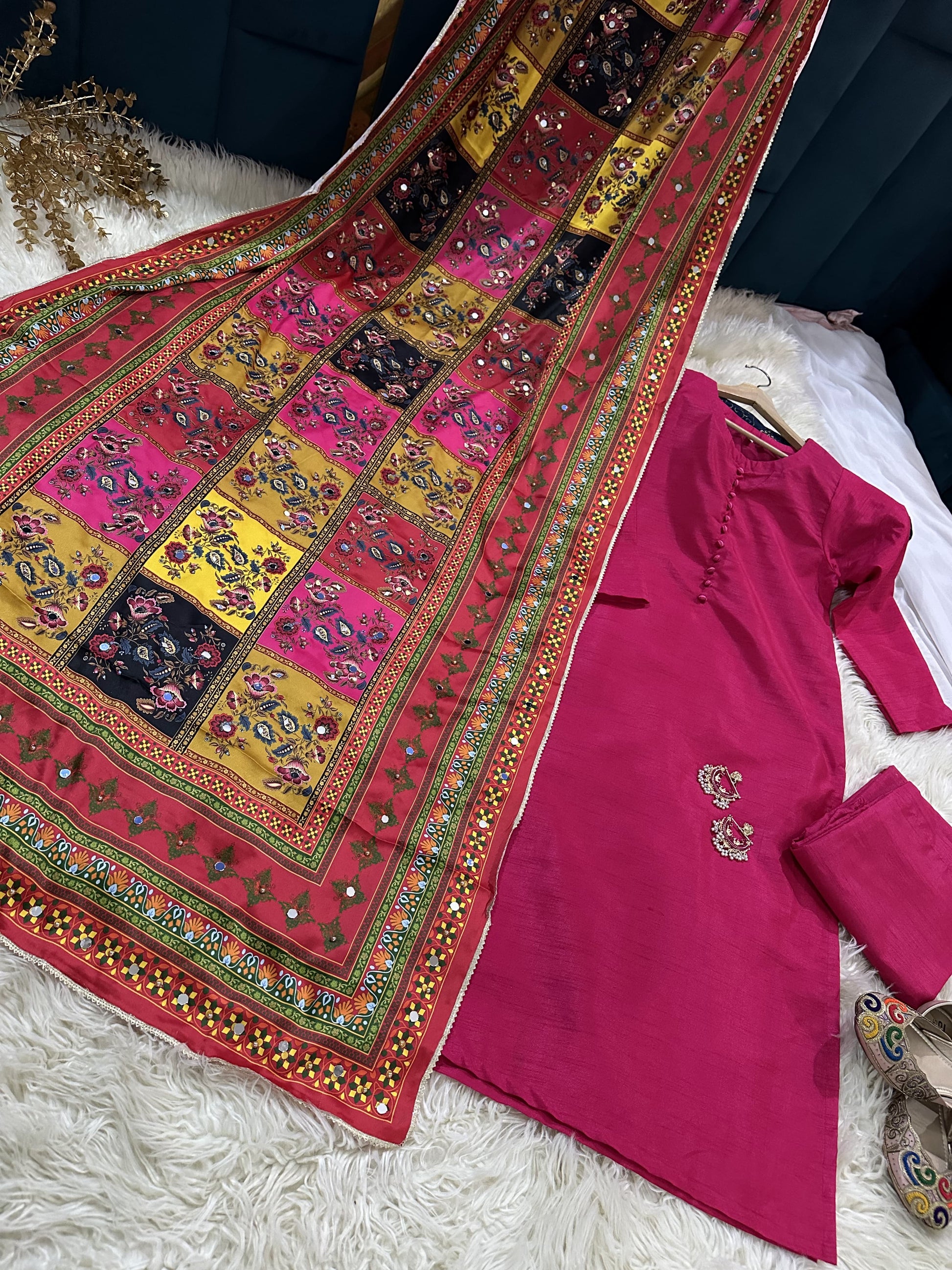 Experience luxury with SHEHLA's rawsilk shirt and pent set, complete with a stunning shamooz silk shawl. Adorned with delicate mirror pearls, this elegant ensemble exudes sophistication and style. Perfect for any formal occasion, SHEHLA is the epitome of high-end fashion.
