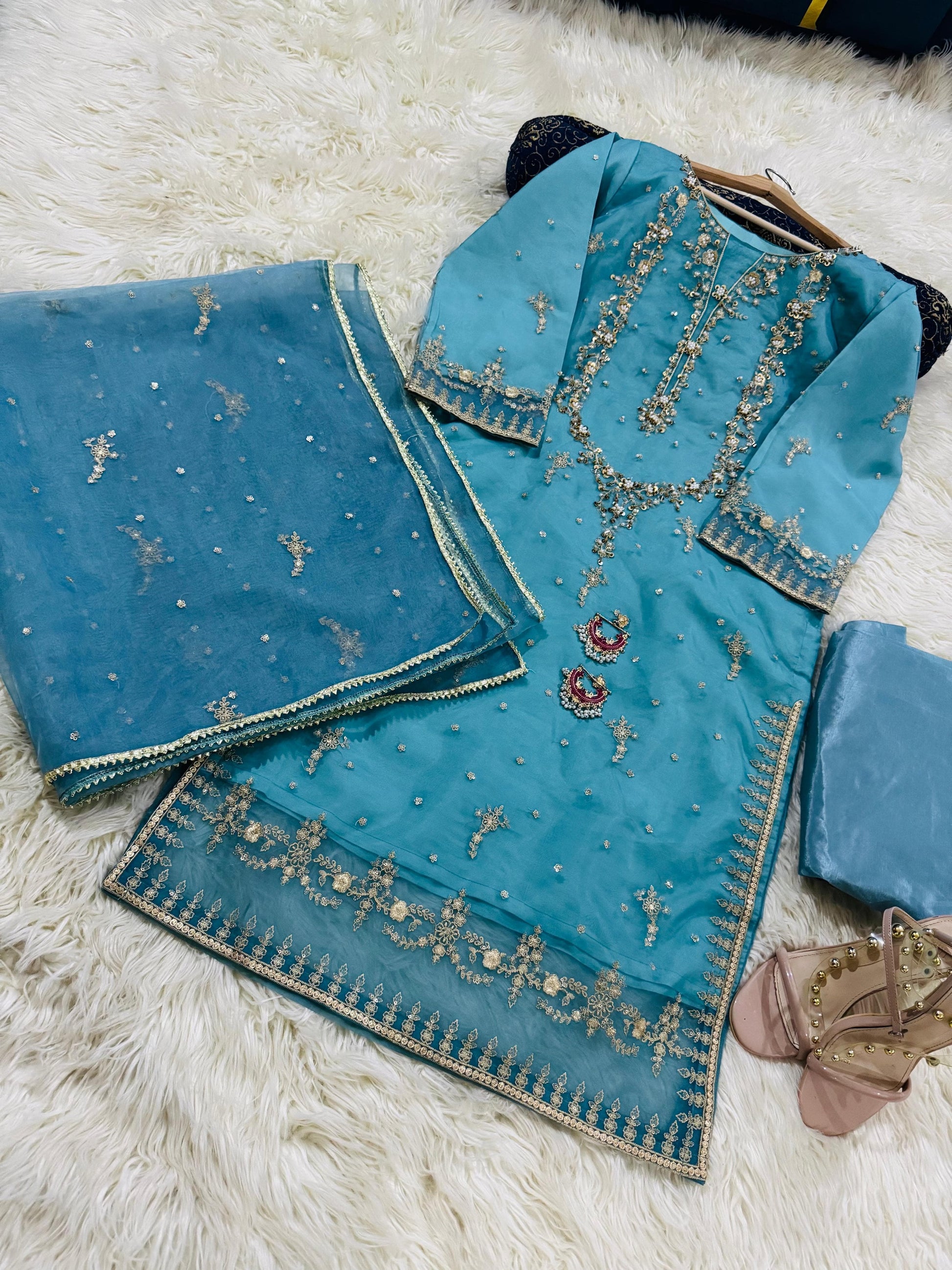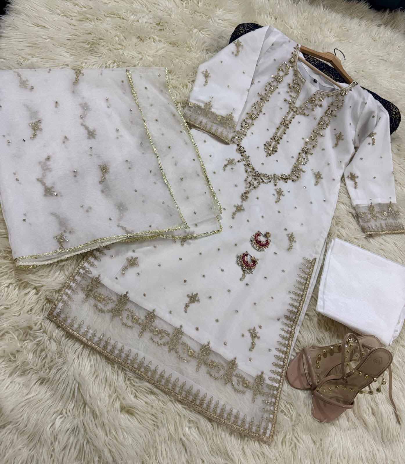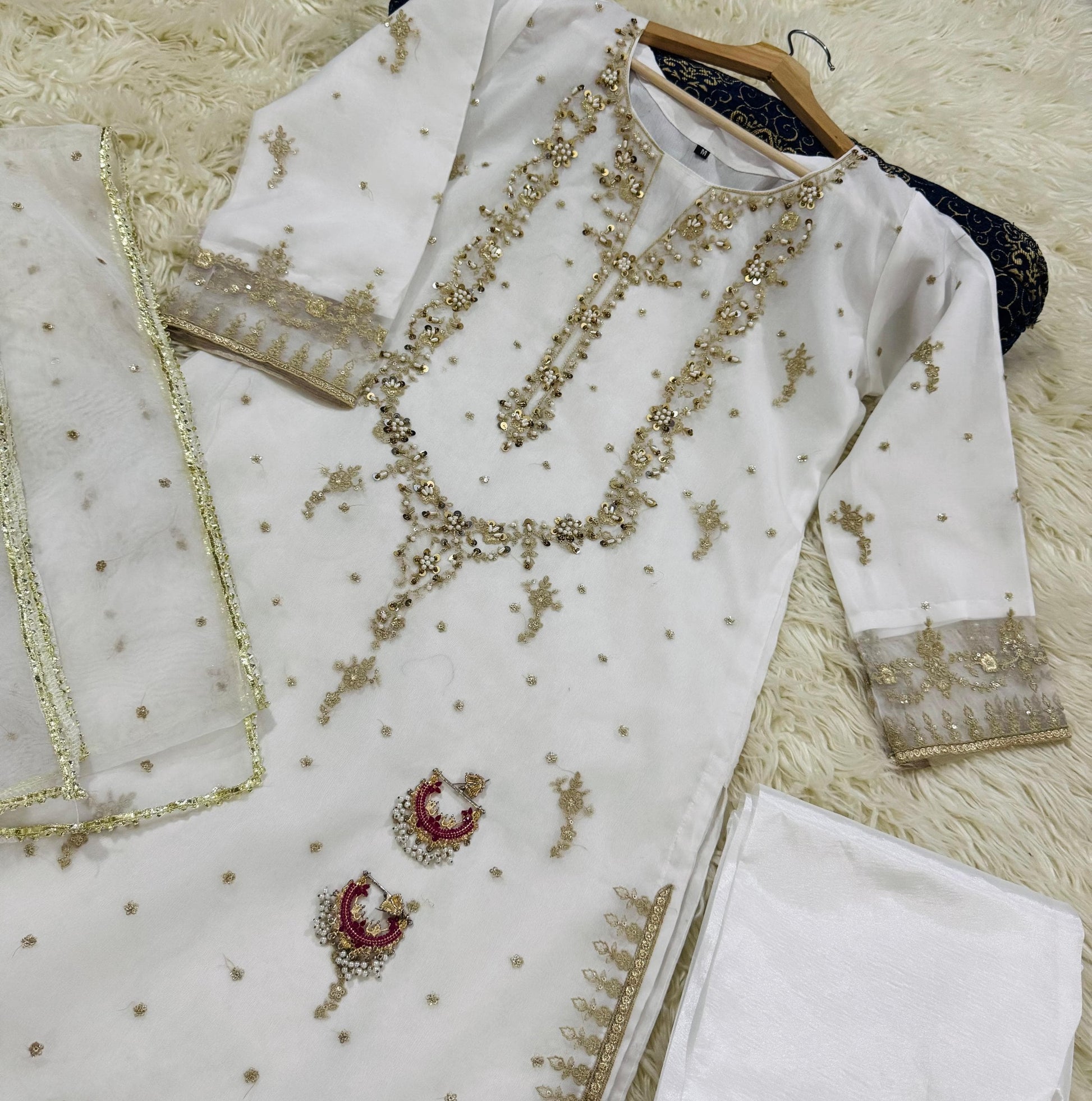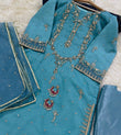 Expertly crafted with sequence and tilla embroidery, the ZARI (3PCS) set offers elegance and sophistication. The long length organza shirt, paired with a beautifully embroidered organza dupatta and raw silk pants, provides a luxurious and stylish look for any occasion.