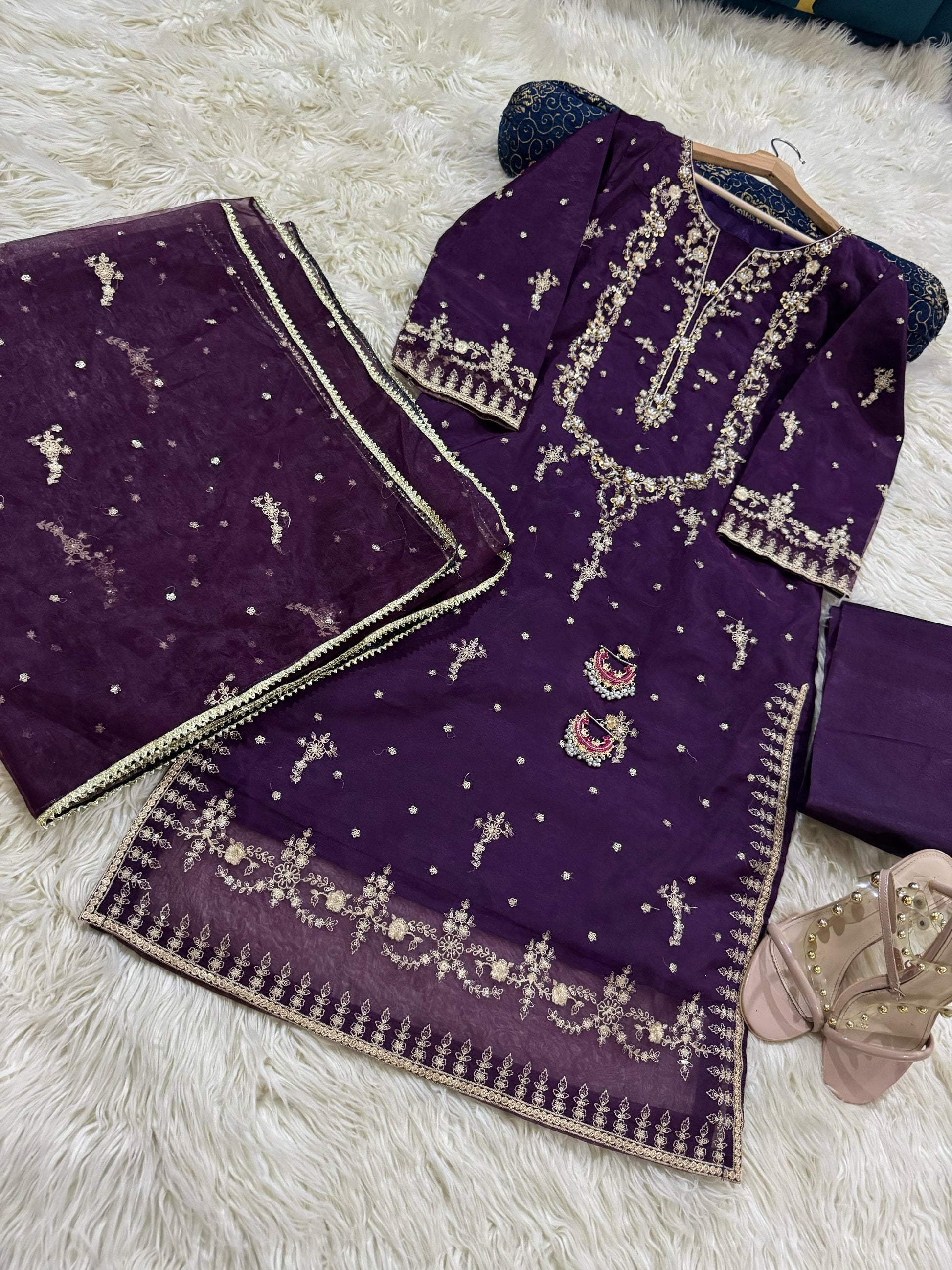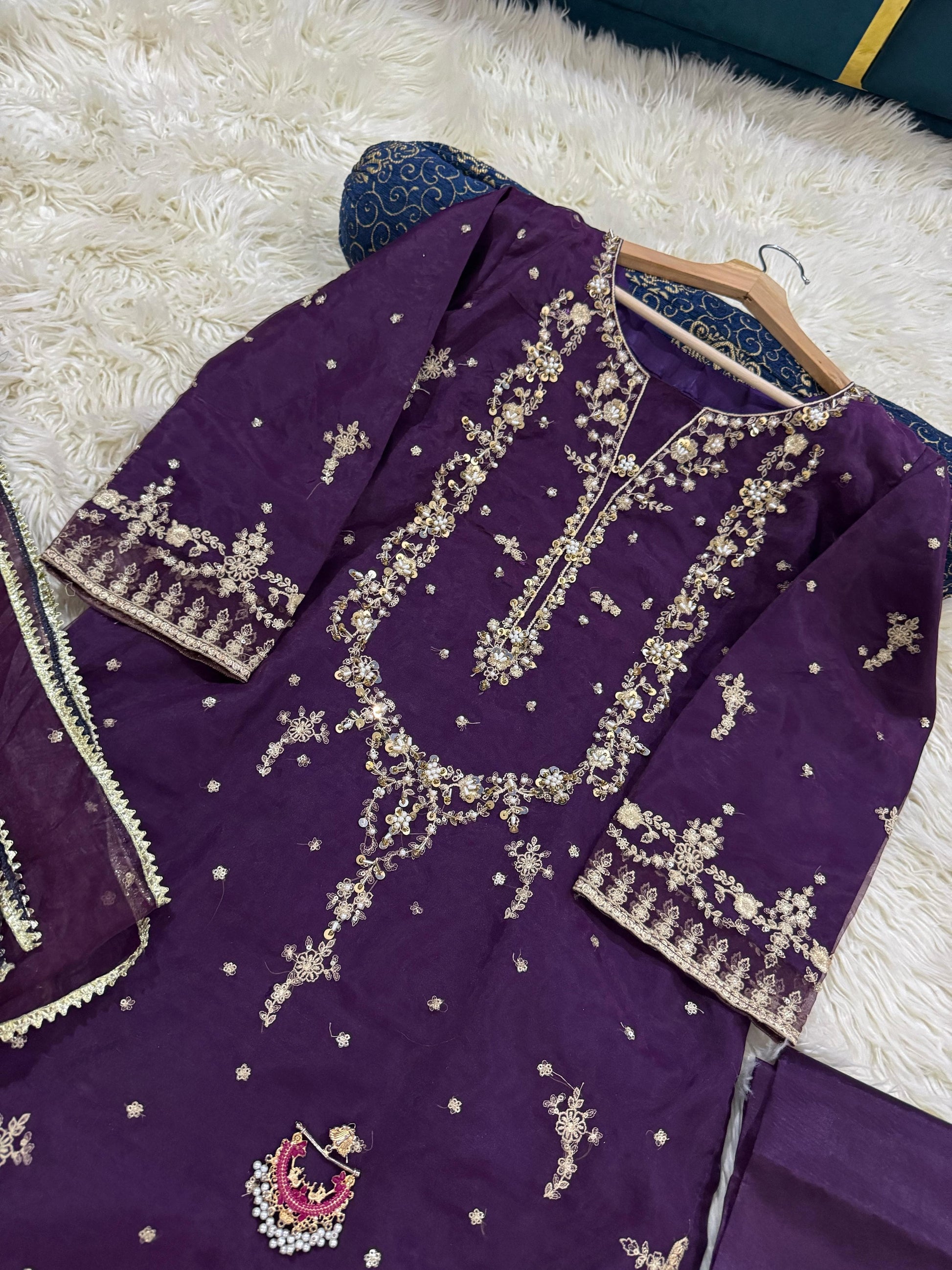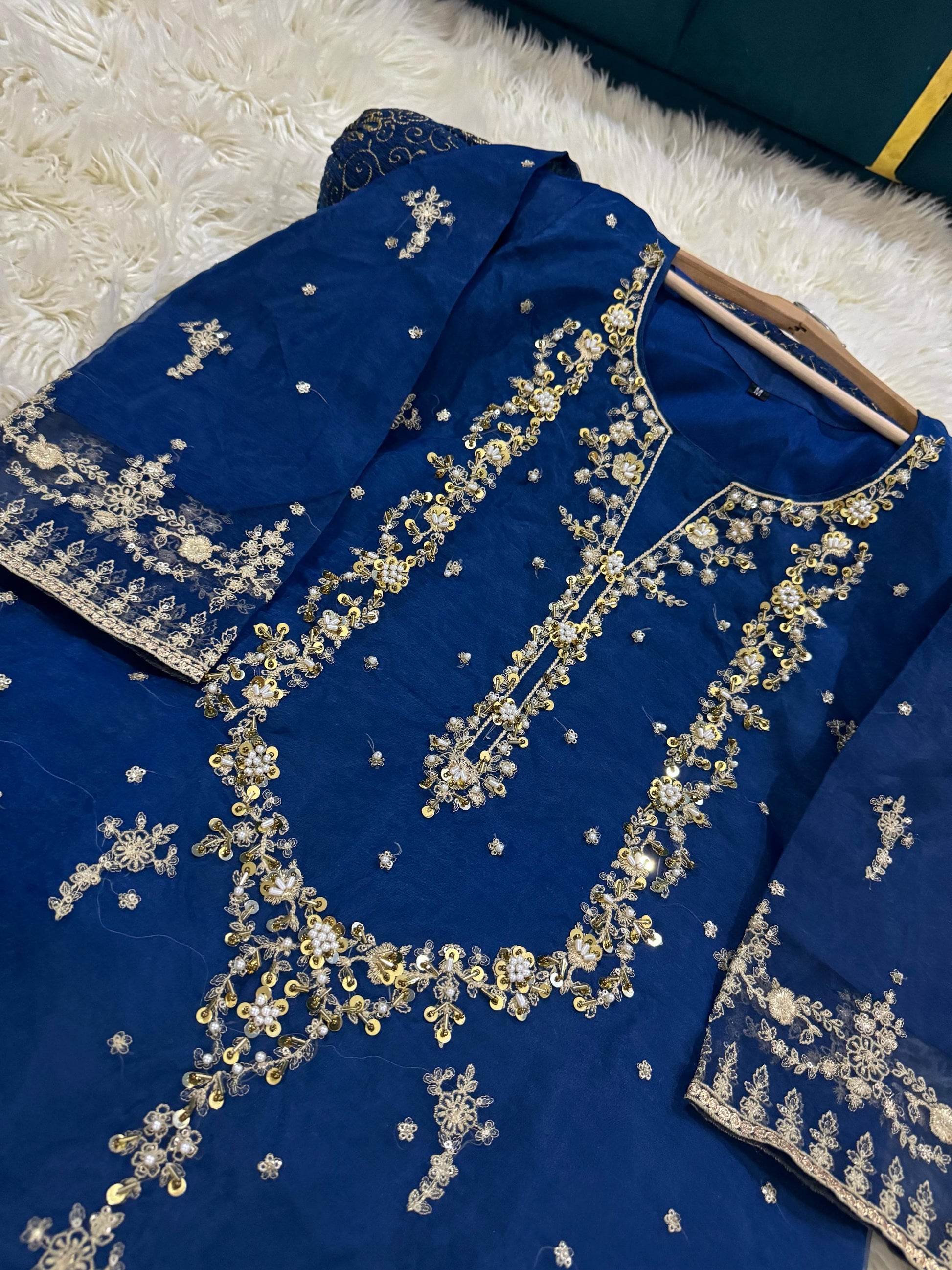 Expertly crafted with sequence and tilla embroidery, the ZARI (3PCS) set offers elegance and sophistication. The long length organza shirt, paired with a beautifully embroidered organza dupatta and raw silk pants, provides a luxurious and stylish look for any occasion.