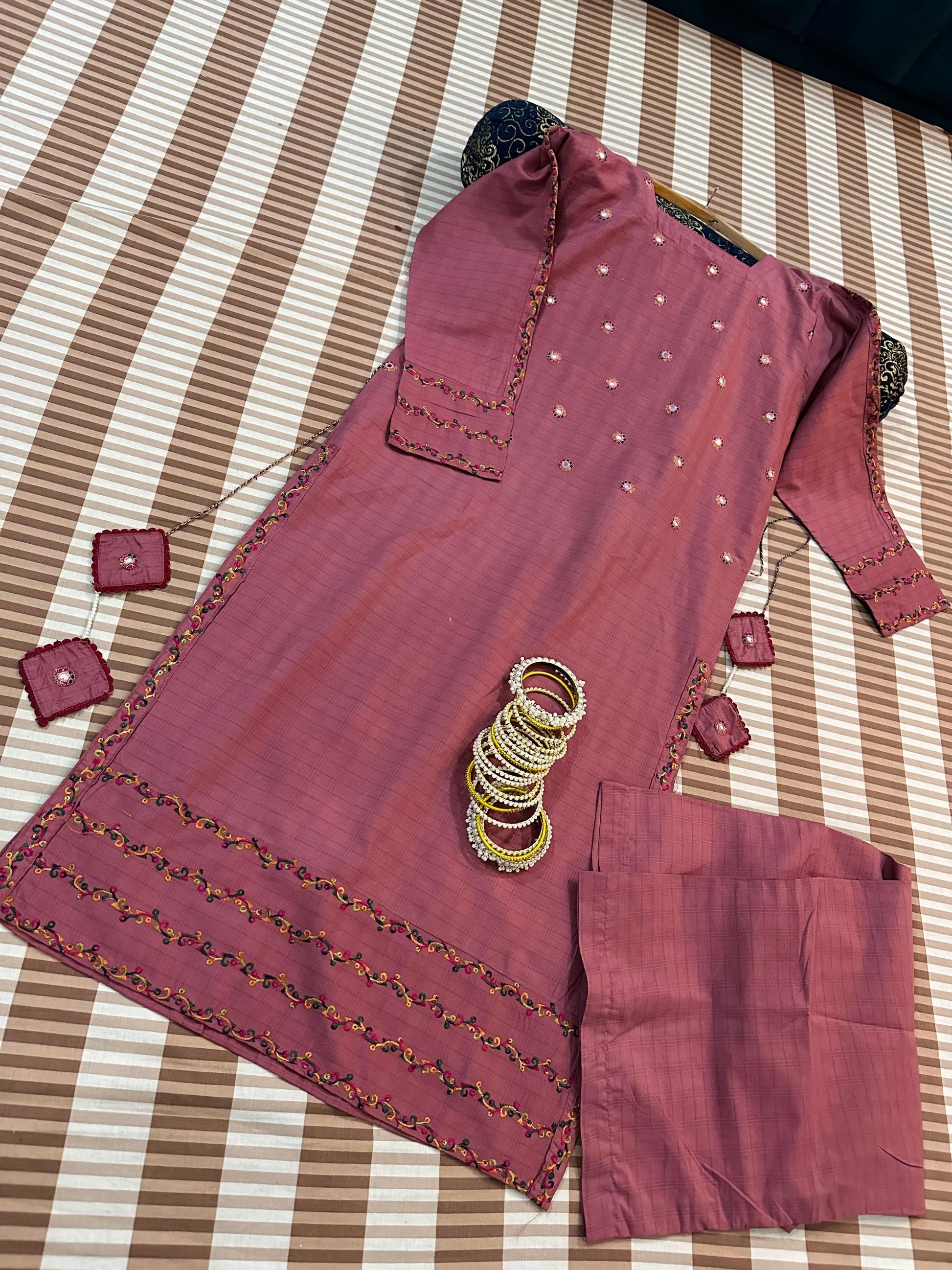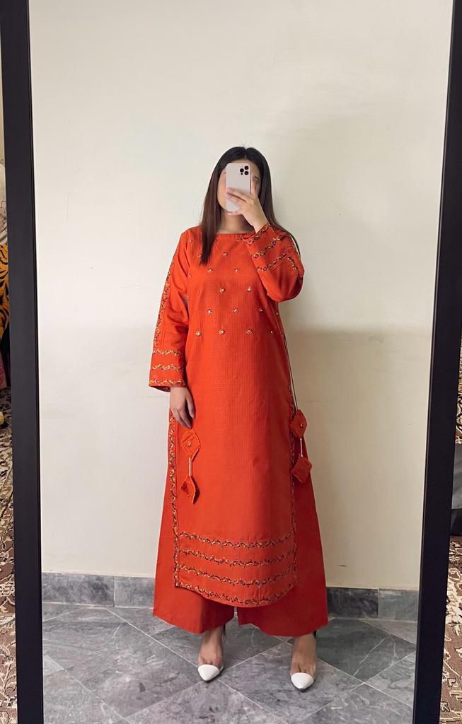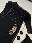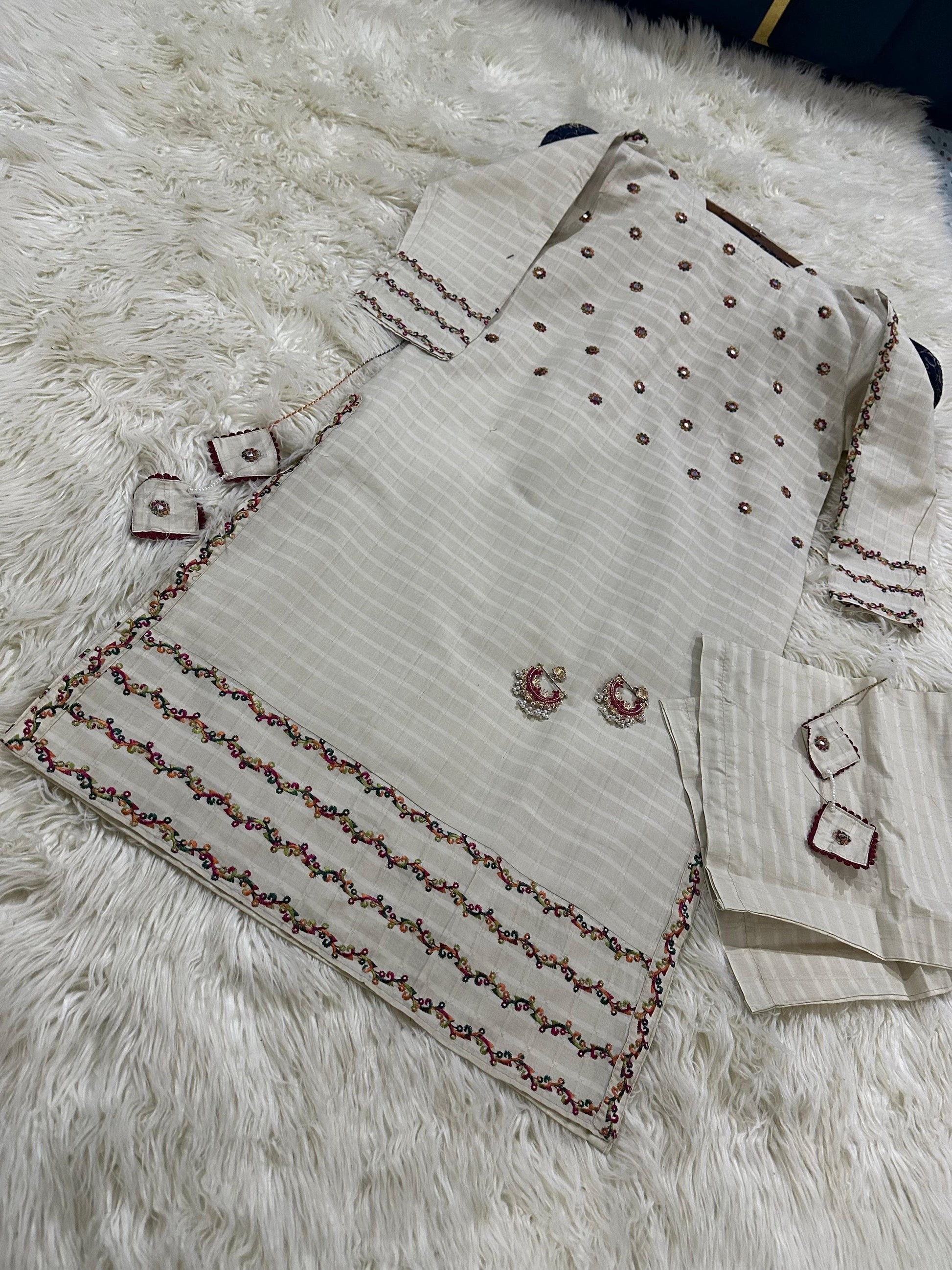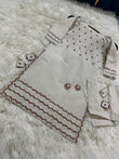Indulge in luxury with ZILE HUMA's Doria Cotton Lawn ensemble. Made from branded, heavy embossed fabric with intricate 9mm sequence work, this set of shirt and plazo provides the perfect blend of comfort and style. Elevate your wardrobe with this elegantly crafted outfit.